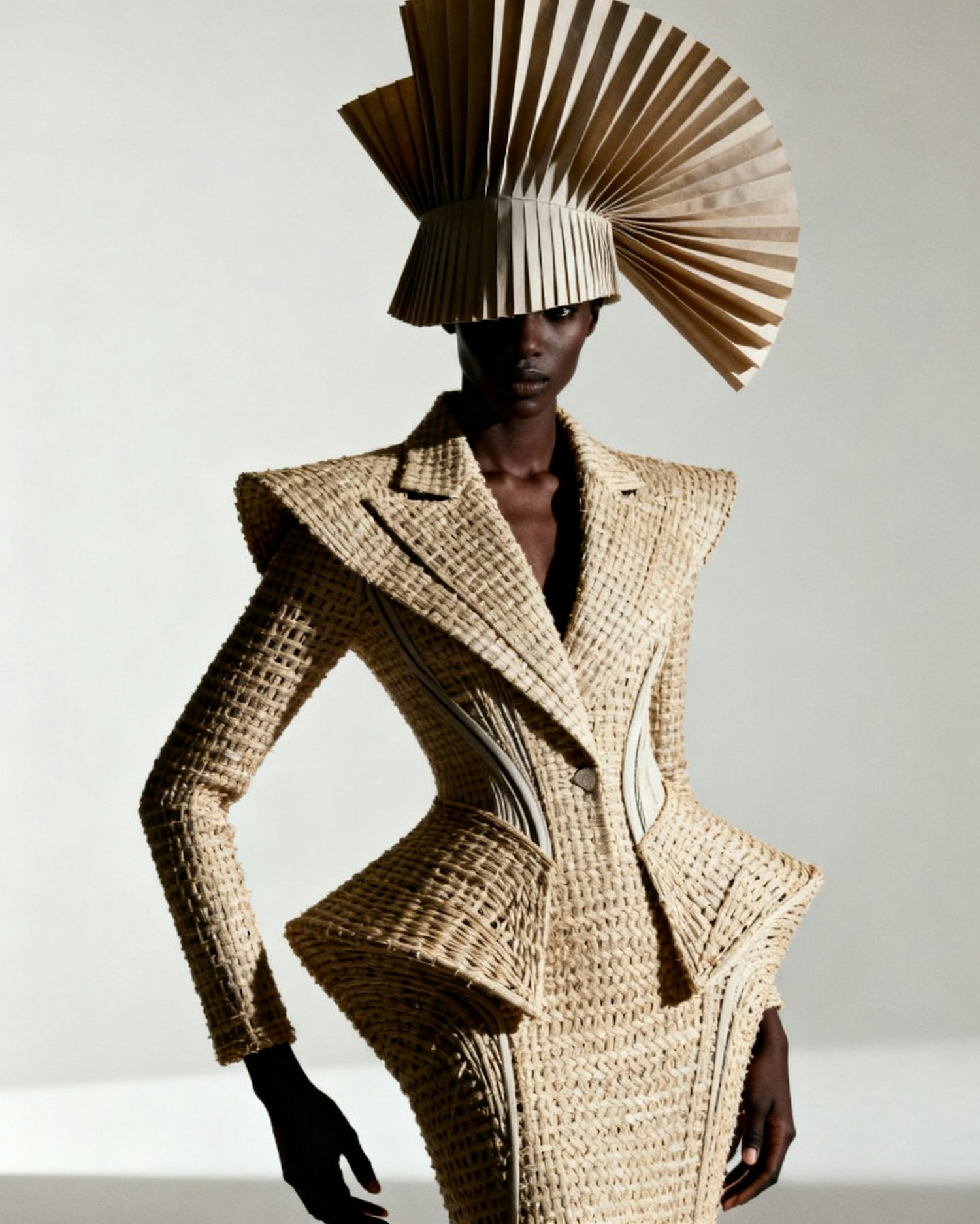 A model in a woven-texture outfit with a dramatic pleated headpiece, showcasing avant-garde fashion in a strikingly lit studio setting.