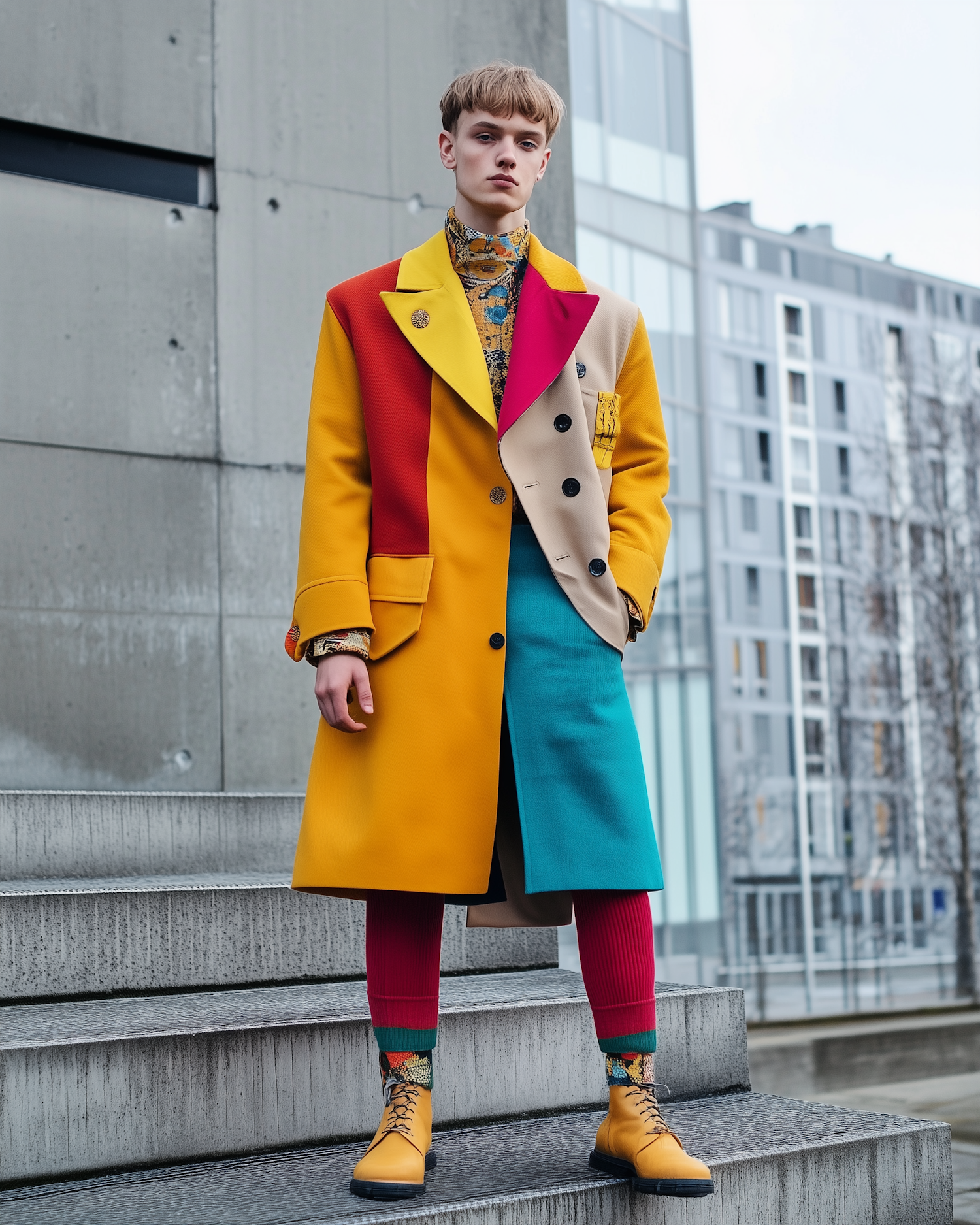 Fashion-forward young man in a colorful coat and yellow boots stands on urban steps, showcasing bold style.