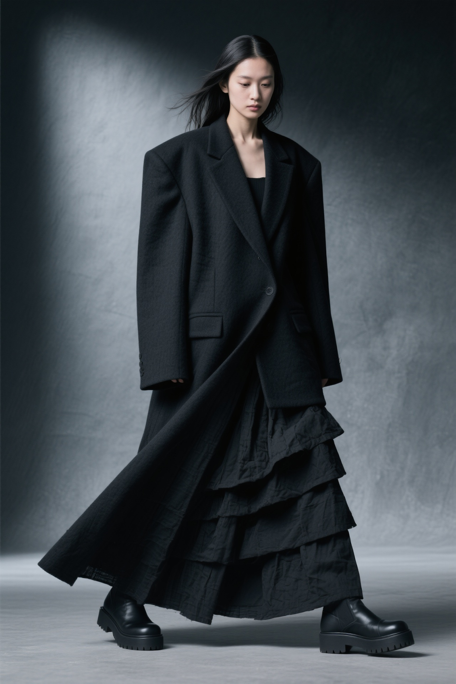 Stylish woman in oversized black blazer, tiered skirt, and chunky boots in a moody, minimalist setting. Bold and edgy monochrome look.