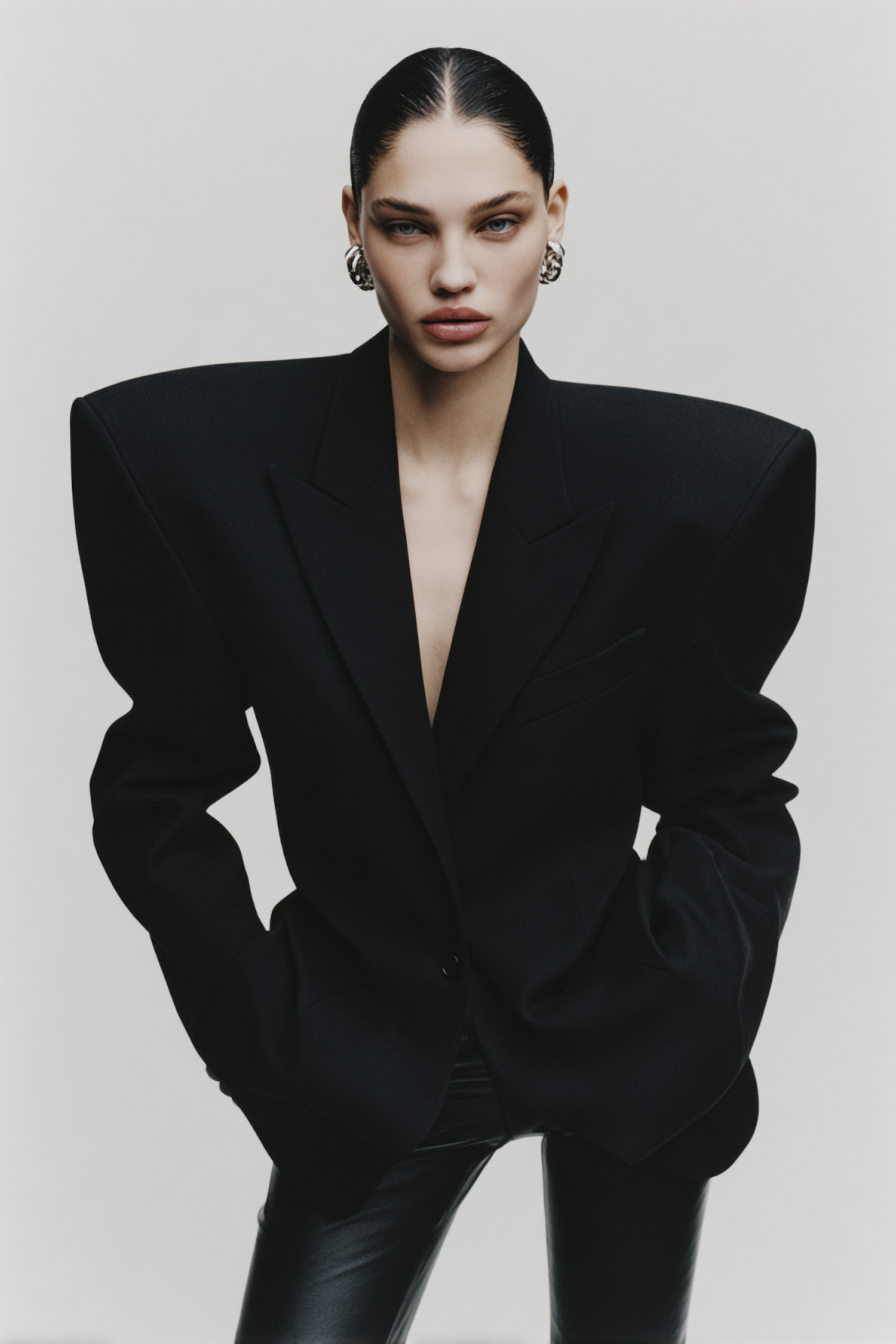 A striking portrait of a person in a bold black blazer with exaggerated shoulders, paired with sleek leather pants and metallic earrings.