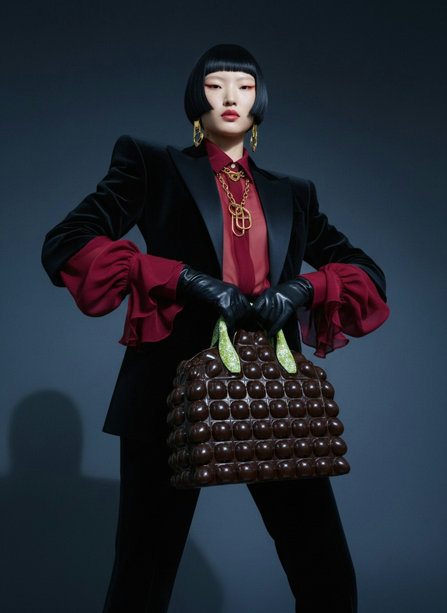 A chic individual in a black blazer and red blouse holds a chocolate-inspired handbag, exuding modern elegance and bold style.