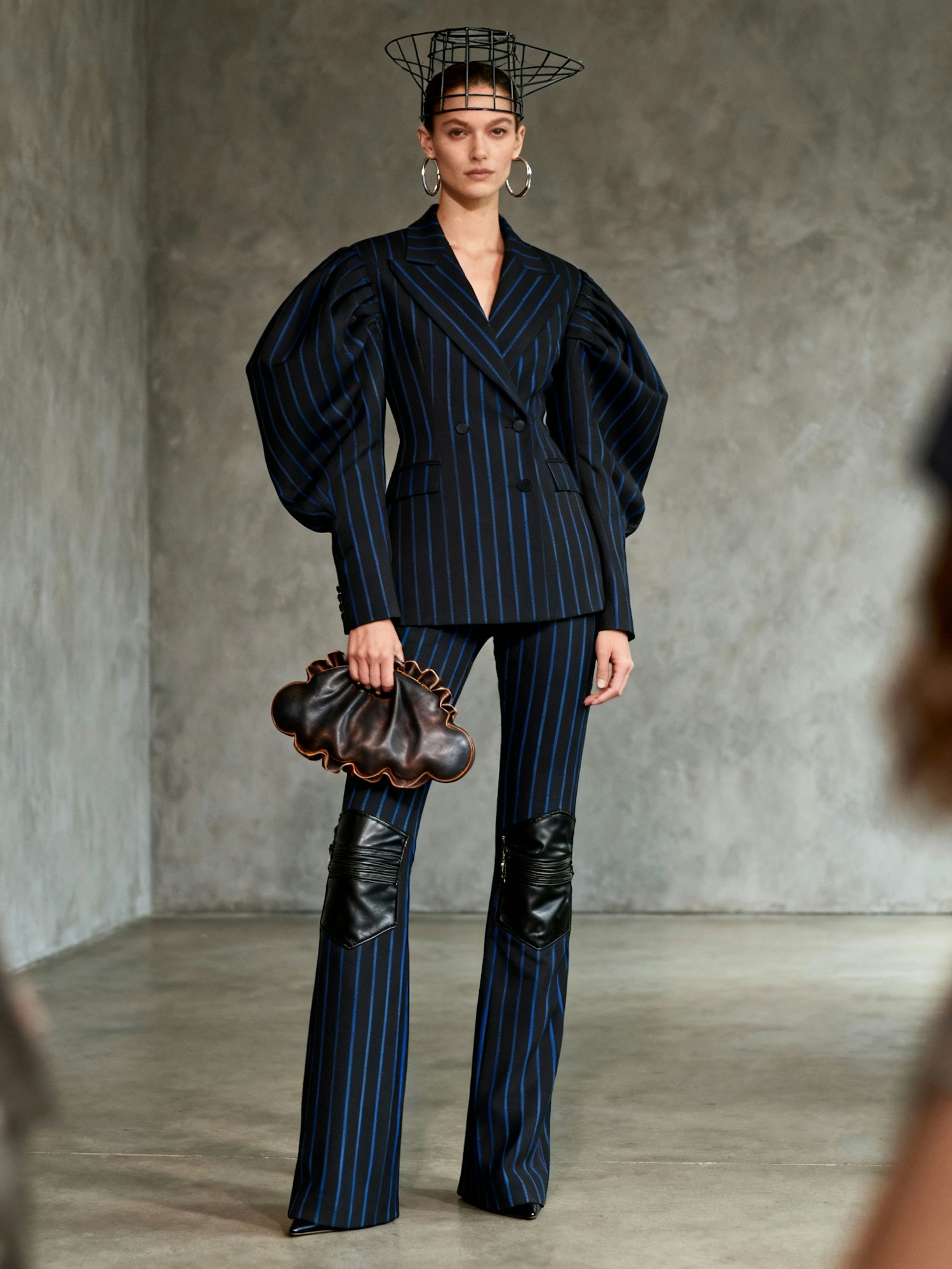 A model in a bold pinstripe suit with puffed sleeves and flared trousers, accessorized with a wireframe headpiece and sculptural clutch.