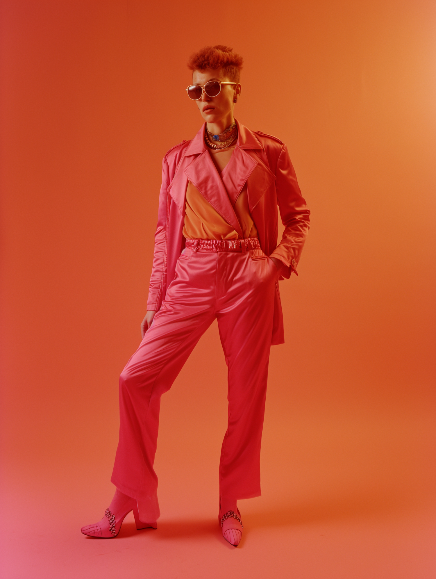 Stylish individual in a vibrant pink and orange outfit with sunglasses, set against a bold orange background.