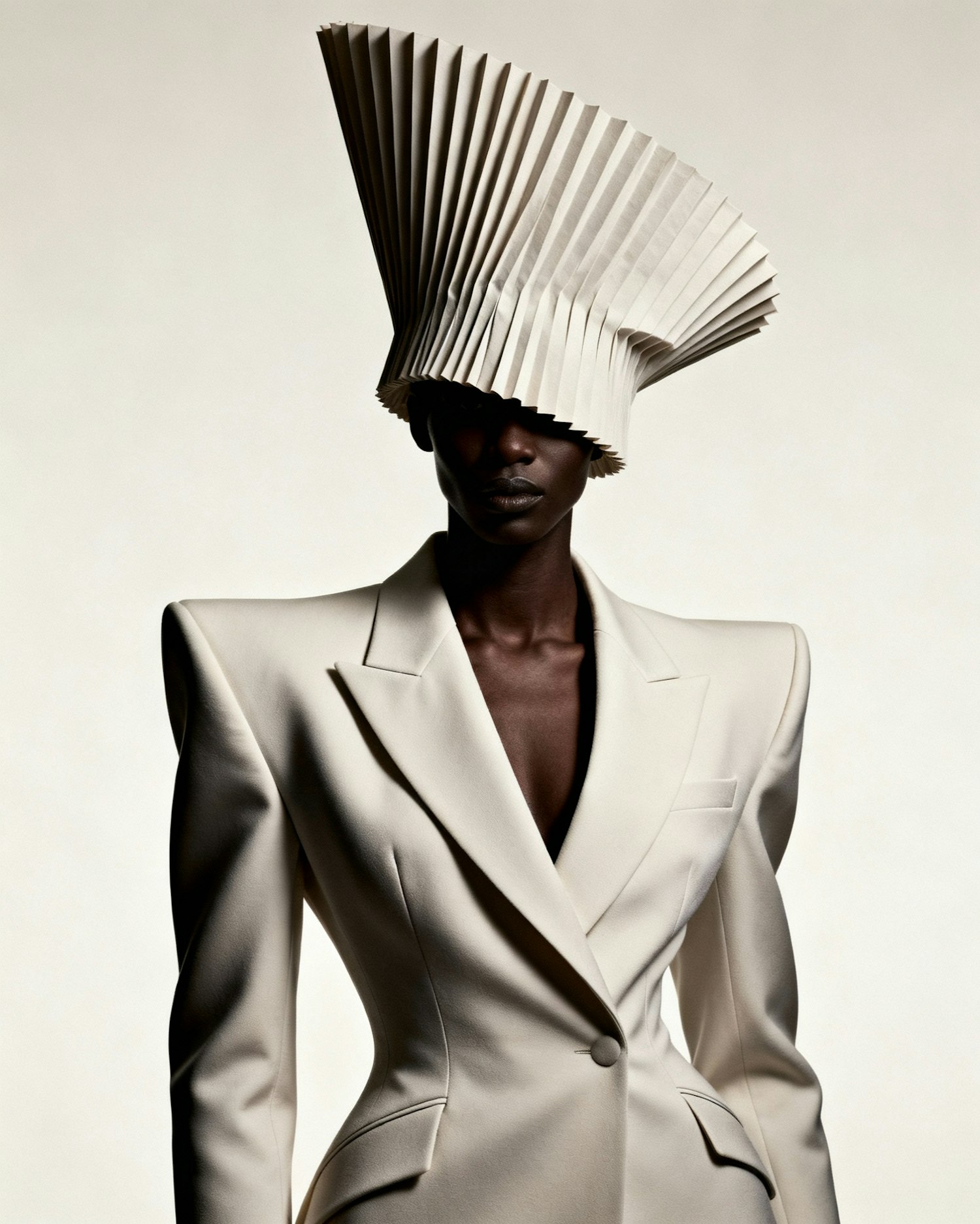 A model in a sharp white blazer and avant-garde pleated headpiece, showcasing bold fashion design against a neutral backdrop.