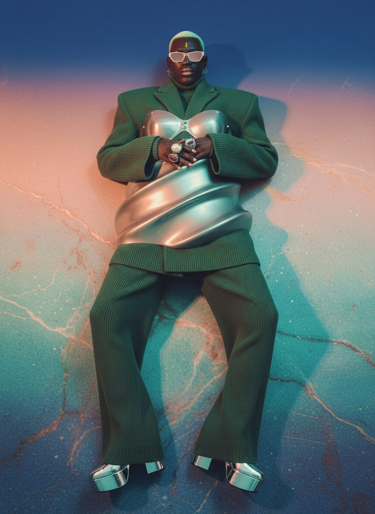 A bold fashion portrait showcasing a green suit with a metallic corset, set against a gradient background for a striking visual impact.