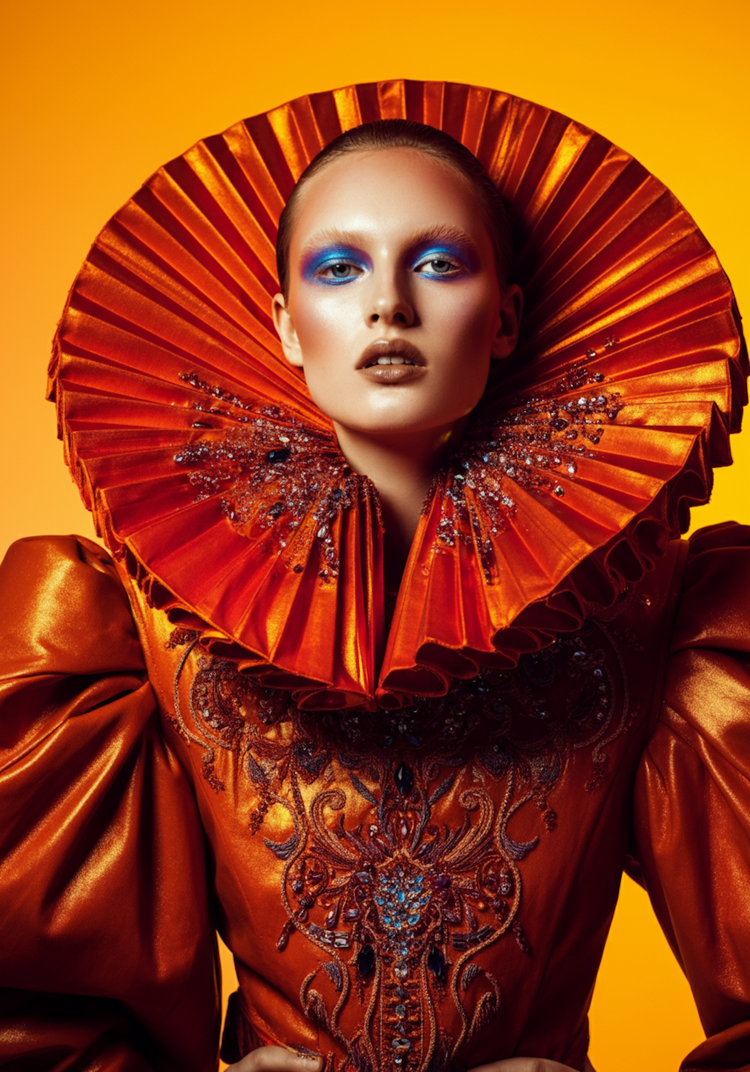 High-fashion portrait with bold orange ruff collar and blue eyeshadow, set against a vibrant orange background.
