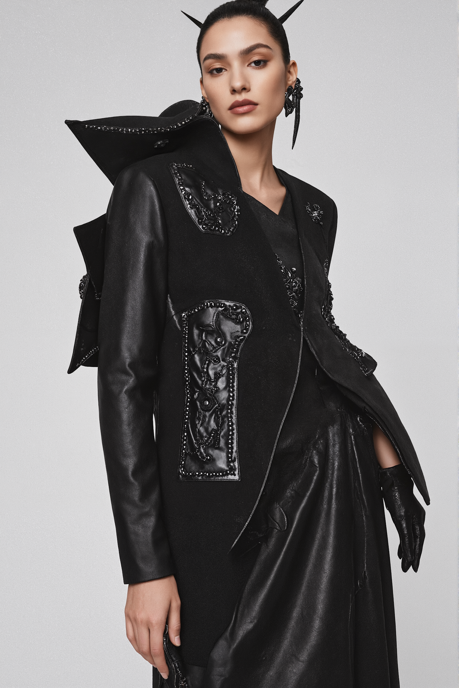 Woman in avant-garde black coat with leather details and embellishments, styled with sleek updo and gloves, against a gray background.