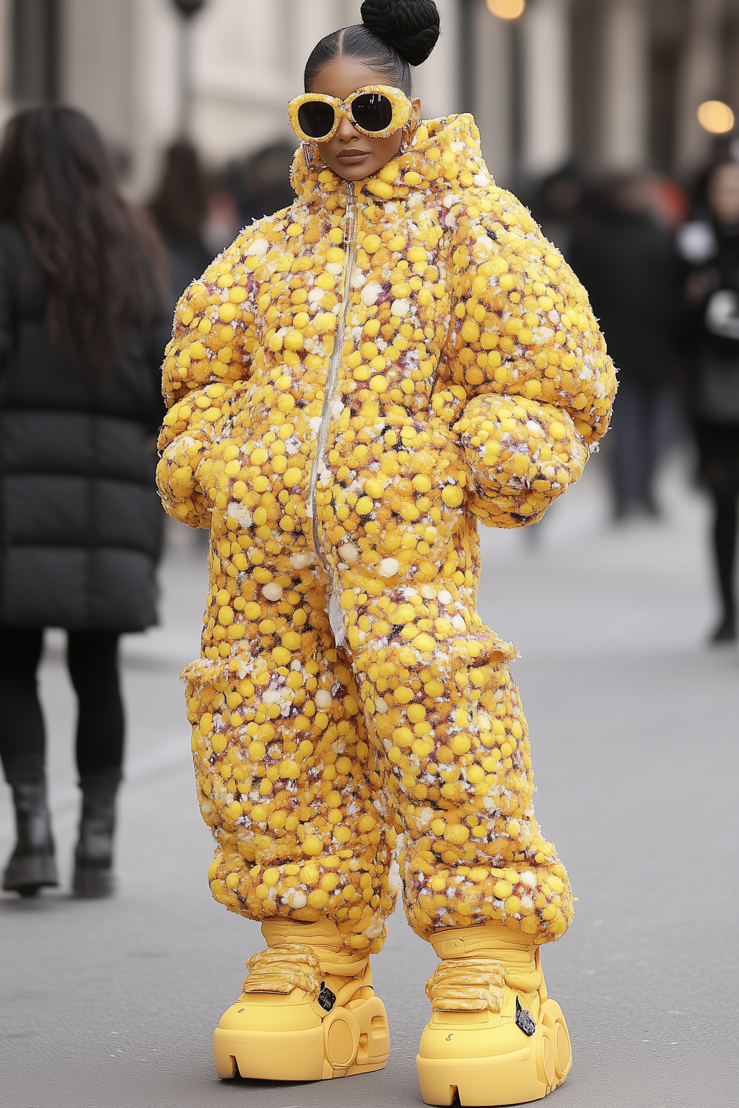 Bold fashion statement with a yellow textured suit and matching sunglasses, complemented by chunky futuristic boots.