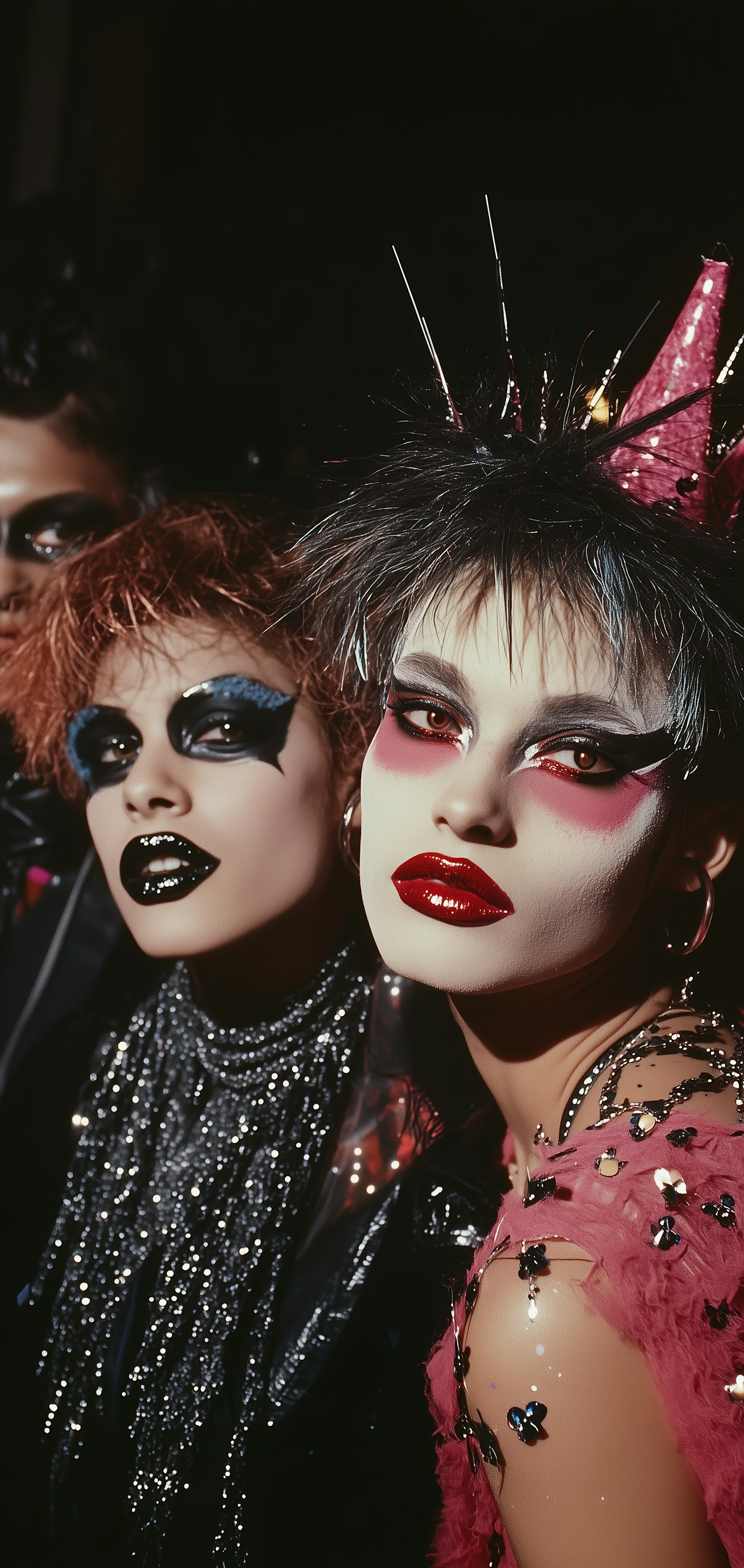 Edgy fashion scene with vibrant pink and black outfits, sequins, and metallic spikes, set against a dark background.