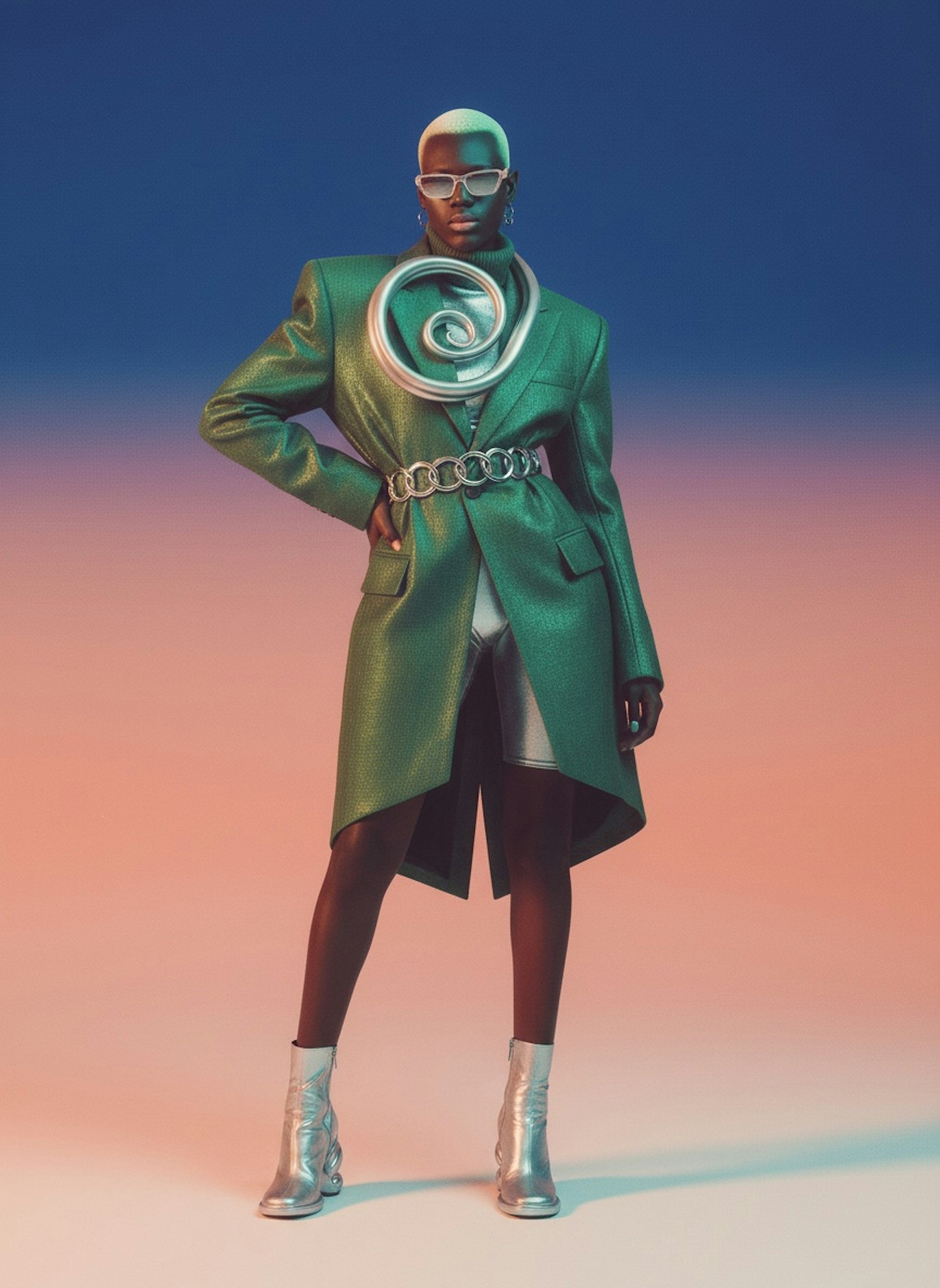A bold fashion statement featuring a metallic green coat, silver accessories, and a gradient background for a futuristic aesthetic.