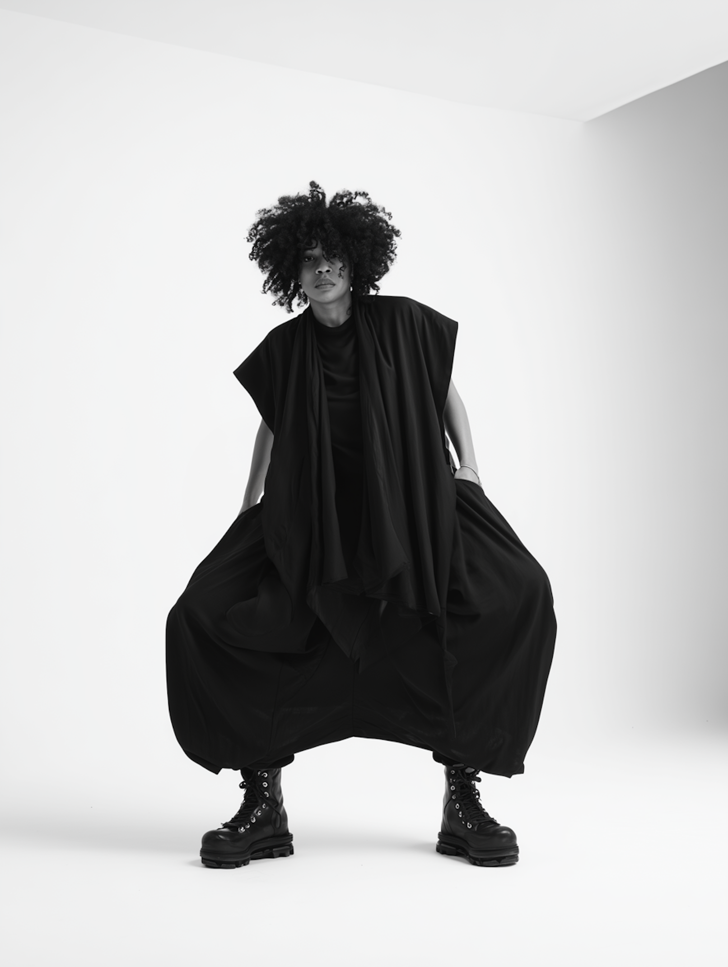 A stylish individual in avant-garde black attire poses dynamically in a minimalist setting, showcasing bold fashion and confidence.