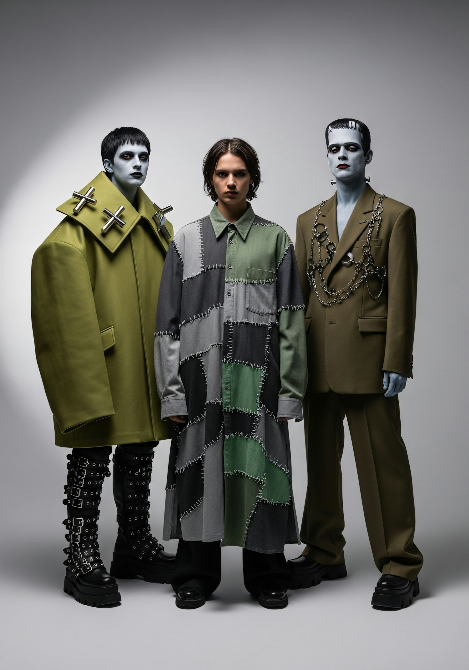 Three individuals in avant-garde fashion, featuring bold colors, unique designs, and striking makeup, set against a neutral background.