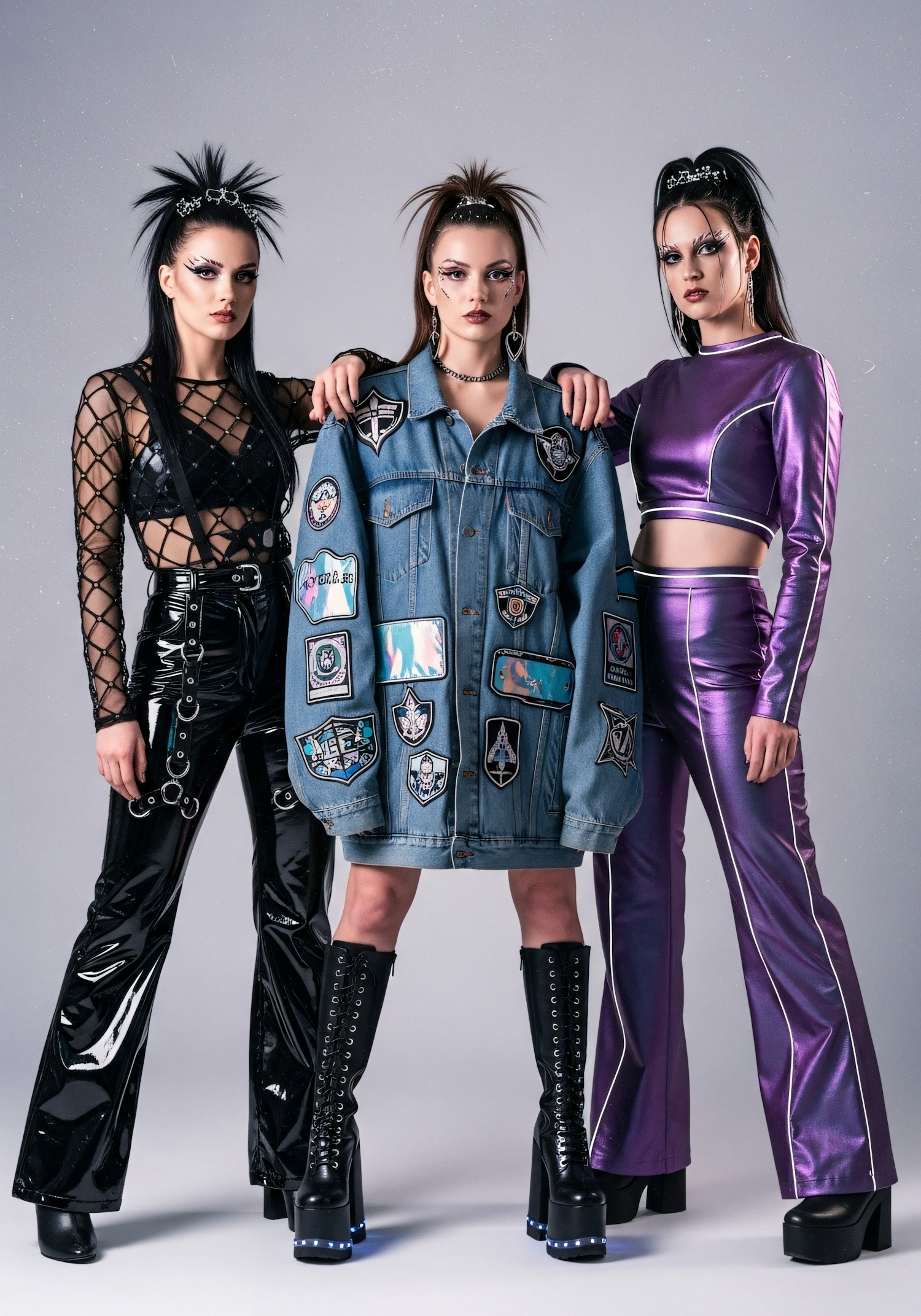 Three individuals in bold, futuristic outfits featuring metallic and denim elements, dramatic makeup, and platform boots, standing confidently.