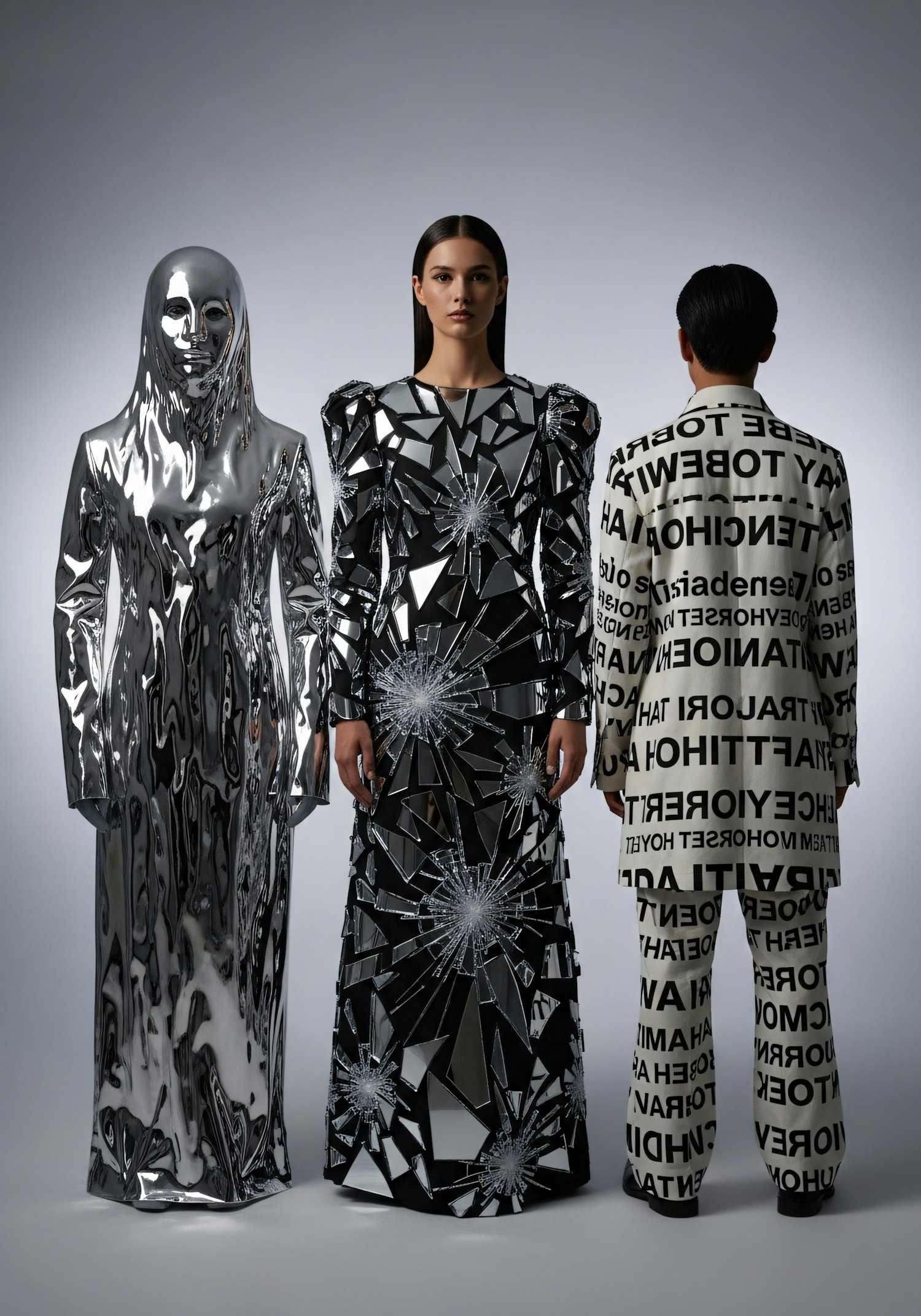 Three individuals in avant-garde outfits: a reflective silver suit, a black dress with mirror fragments, and a white suit with bold text.