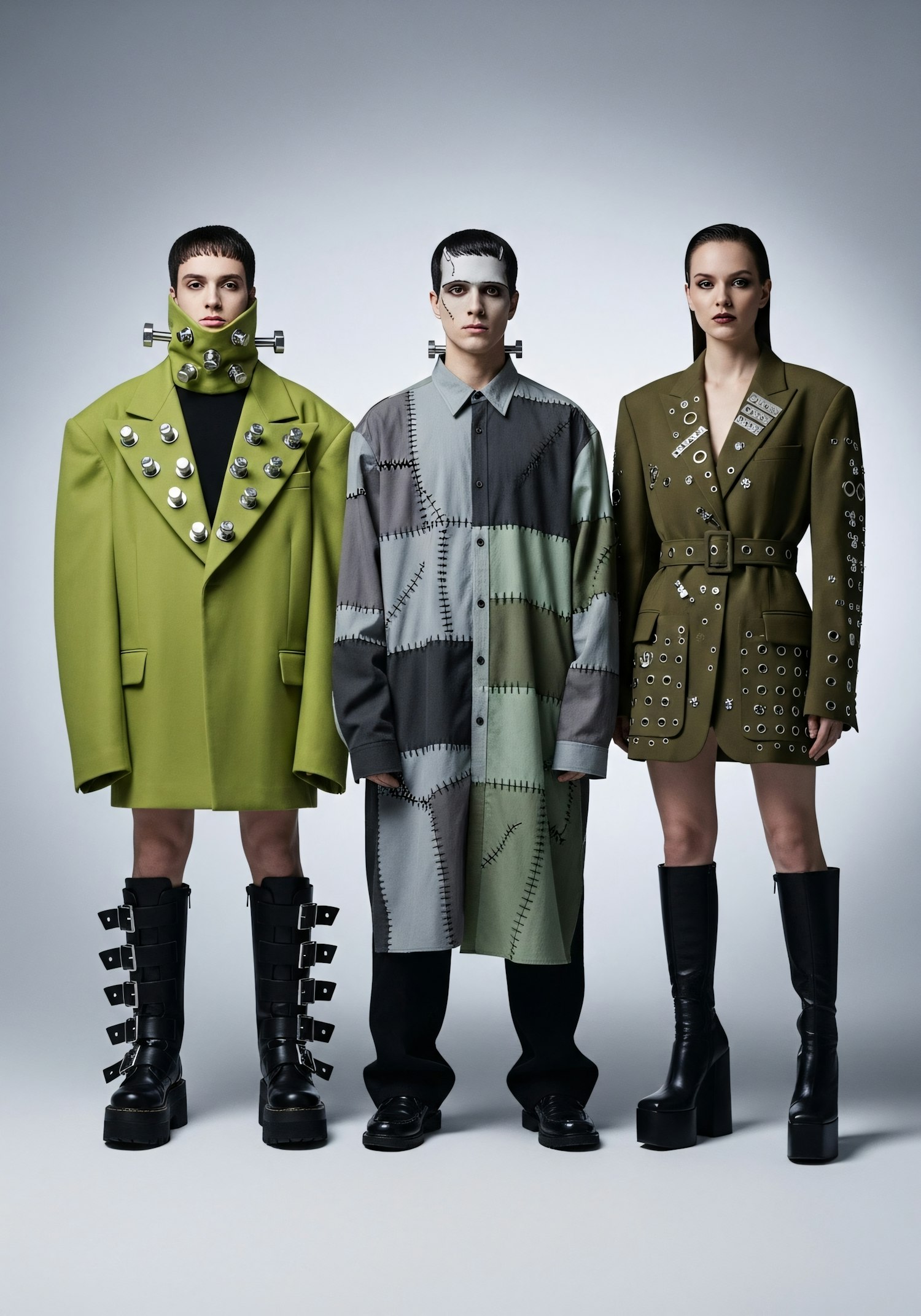 Three models showcase bold, industrial-inspired fashion with metallic accents and patchwork designs in a minimalist studio setting.