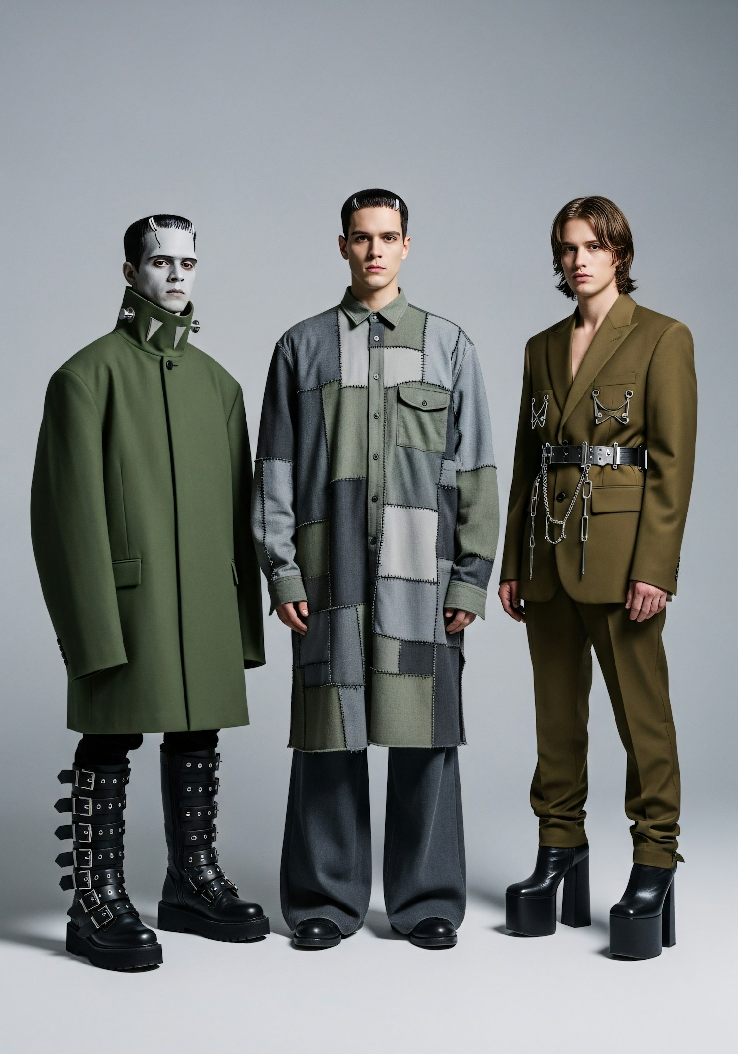 Three individuals showcase avant-garde fashion with bold designs, including patchwork, metallic details, and platform boots, in a studio setting.