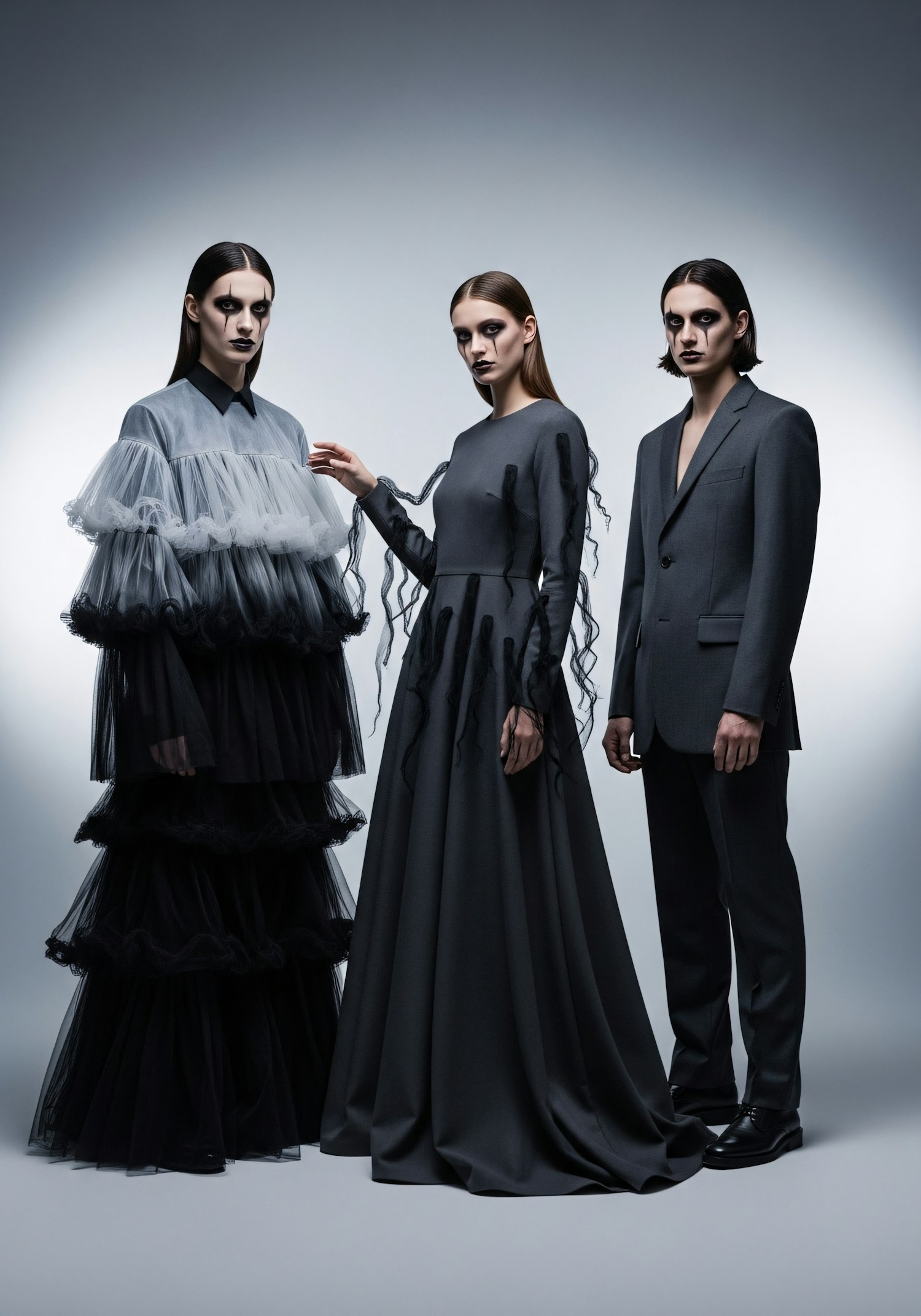 Three individuals in avant-garde monochromatic outfits, featuring dramatic makeup and sleek hairstyles, in a minimalist studio setting.