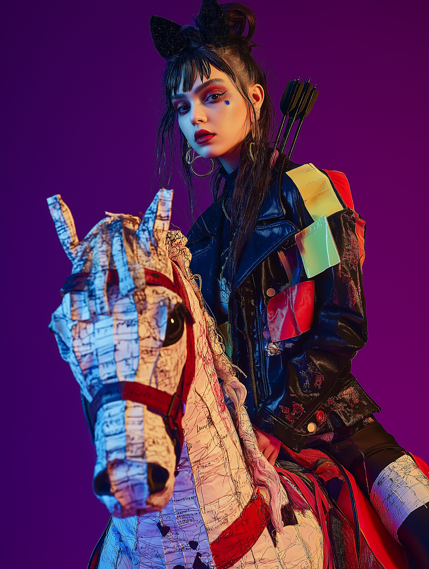 A stylish woman with cat ears and bold makeup rides a map-patterned horse against a vibrant purple background.