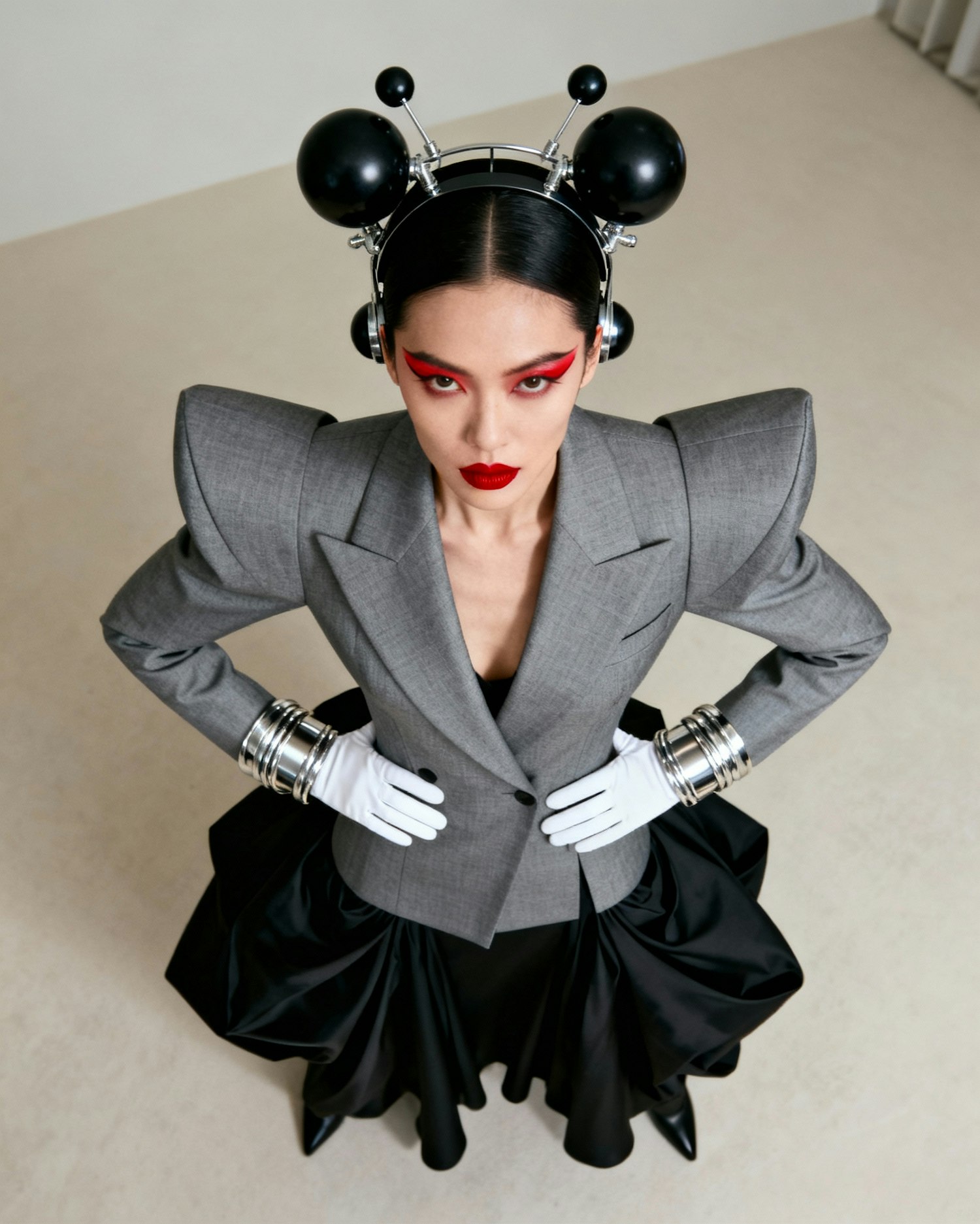 Ultra-high-definition fashion portrait of a striking individual in a sculptural, avant-garde ensemble that blends futurism with high editorial drama. They wear a structured grey blazer with exaggerated shoulders layered over a flowing black skirt, accessorized with oversized silver bangles, crisp white gloves, and a bold, symmetrical headpiece featuring black spheres and metallic accents. Their makeup is sharp and expressive—red eyeliner and lipstick adding cinematic tension. The pose is stylized and commanding, set against a minimalist backdrop that enhances the silhouette and textures. The overall mood is futuristic, theatrical, and culturally resonant—ideal for a fashion editorial that explores identity, innovation, and visual storytelling through bold contrasts and sculptural form.