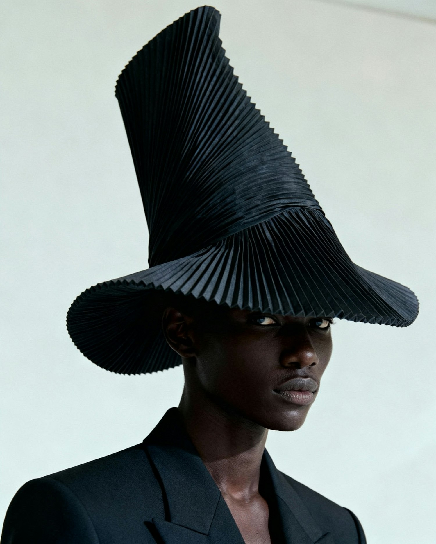 A bold portrait of a person in a sculptural black pleated hat and tailored outfit, set against a minimal background.