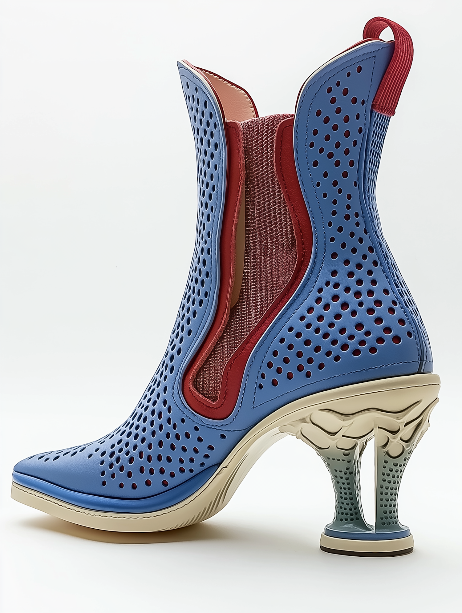 Unique blue high-heeled boot with perforated design and sculptural cream heel, accented with red side panels for a bold look.