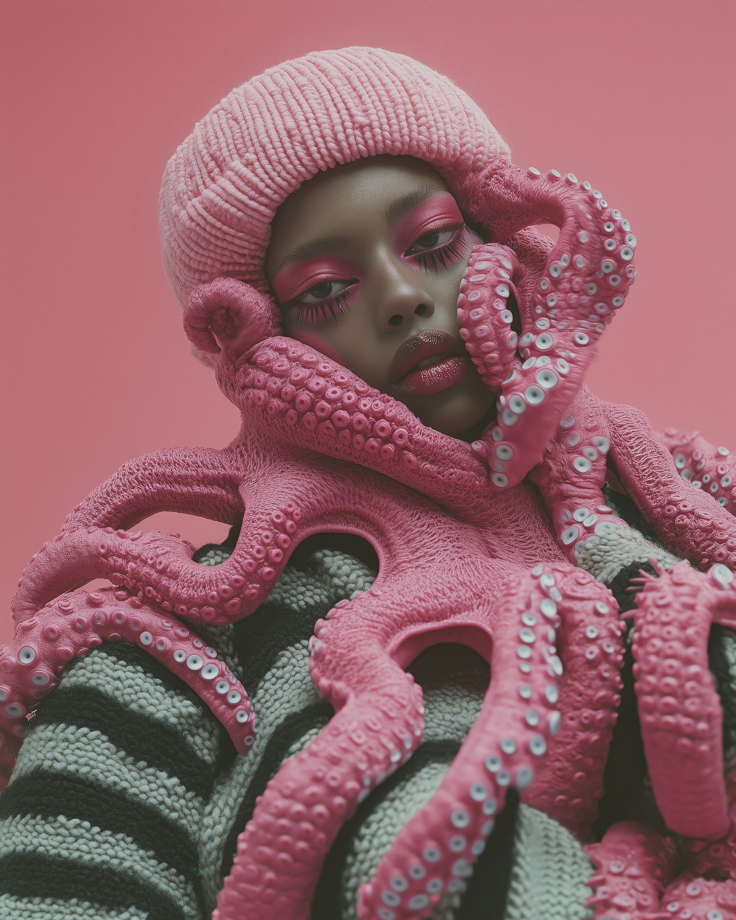 Bold fashion portrait with pink tentacle-like outfit, dramatic makeup, and a monochromatic pink background. Surreal and artistic vibe.
