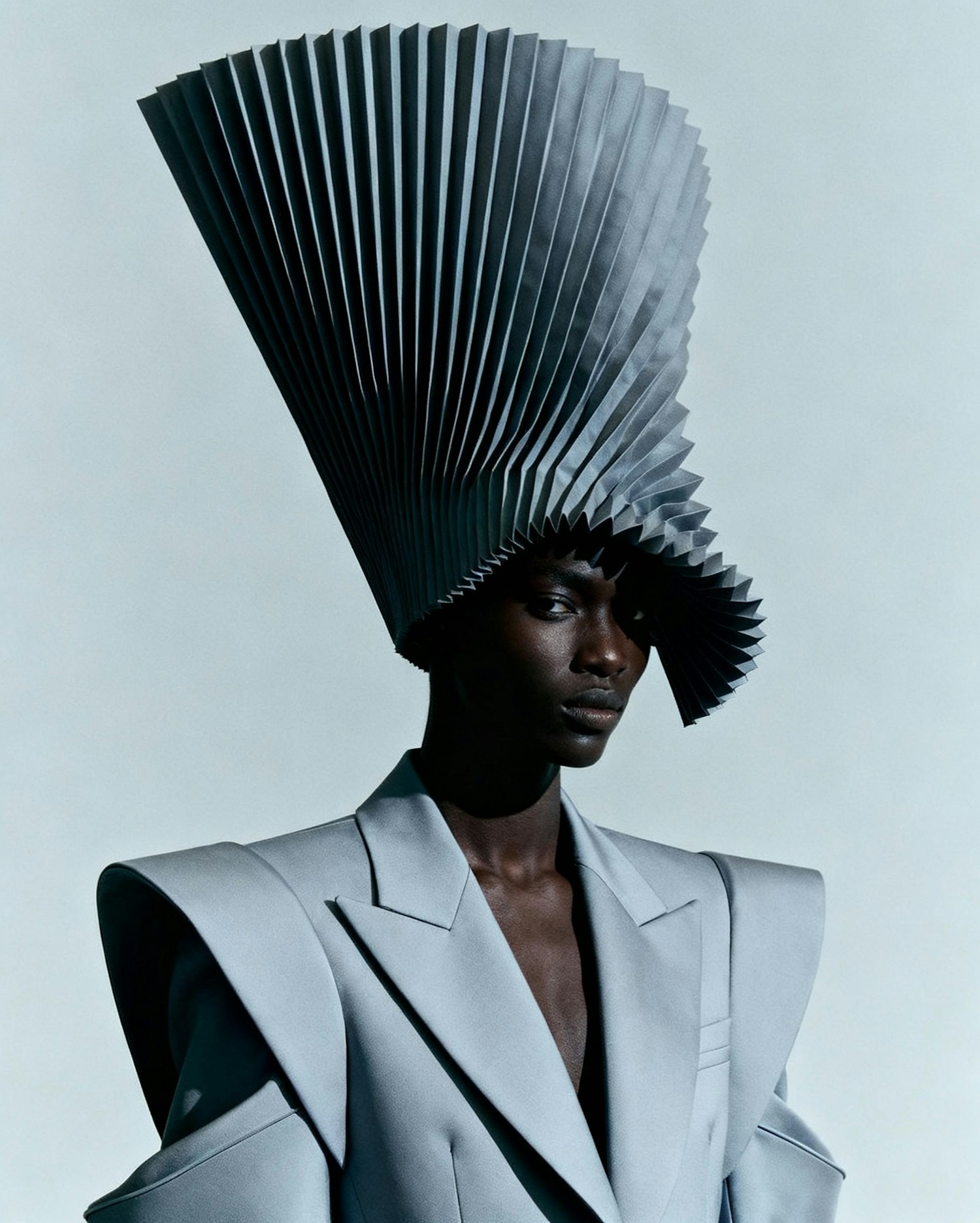 A striking portrait of a person in avant-garde fashion, featuring a pleated headpiece and structured jacket, set against a minimal background.