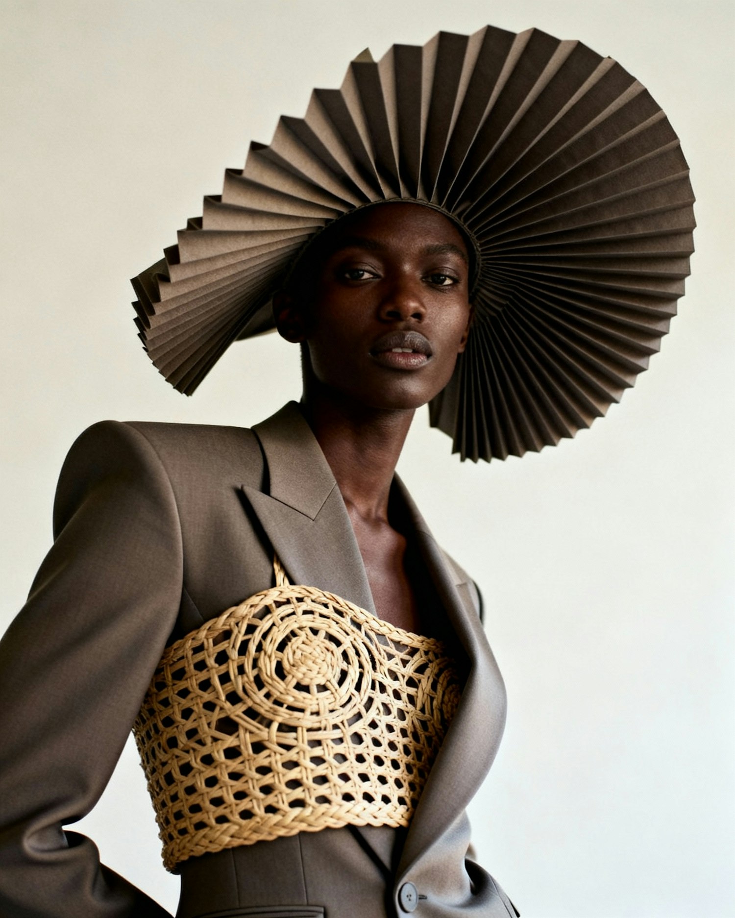 An ultra-high-definition fashion portrait of a mysterious Black individual in a woven, artistic top poses confidently, showcasing intricate design and elegance against a minimal background, dressed in a sculptural pleated headpiece, set against a light minimalist background. The ensemble blends futuristic tailoring with avant-garde elegance, emphasising clean lines and bold silhouettes. The pleated headpiece adds architectural drama, while the suit contours softly around the body, celebrating form and presence. Lighting is soft and directional, casting subtle shadows that enhance texture and depth. The mood is enigmatic, editorial, and visually commanding—ideal for showcasing inclusive fashion through sculptural styling and cinematic clarity.