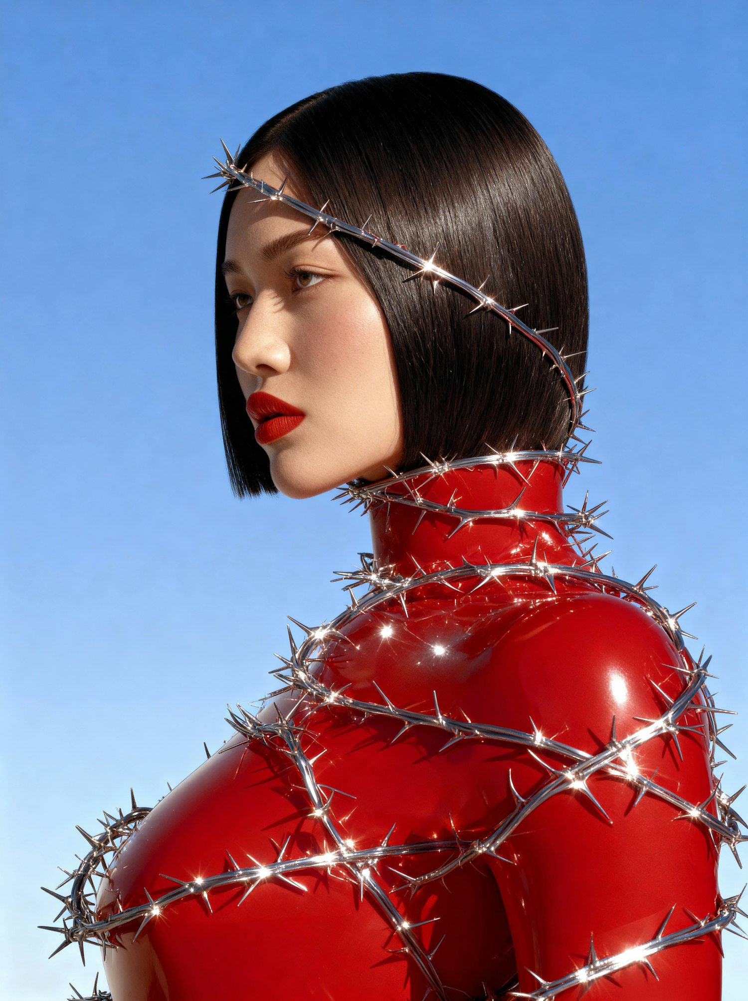 A bold and artistic portrait featuring a person in a red glossy outfit with metallic barbed wire, set against a vivid blue sky.