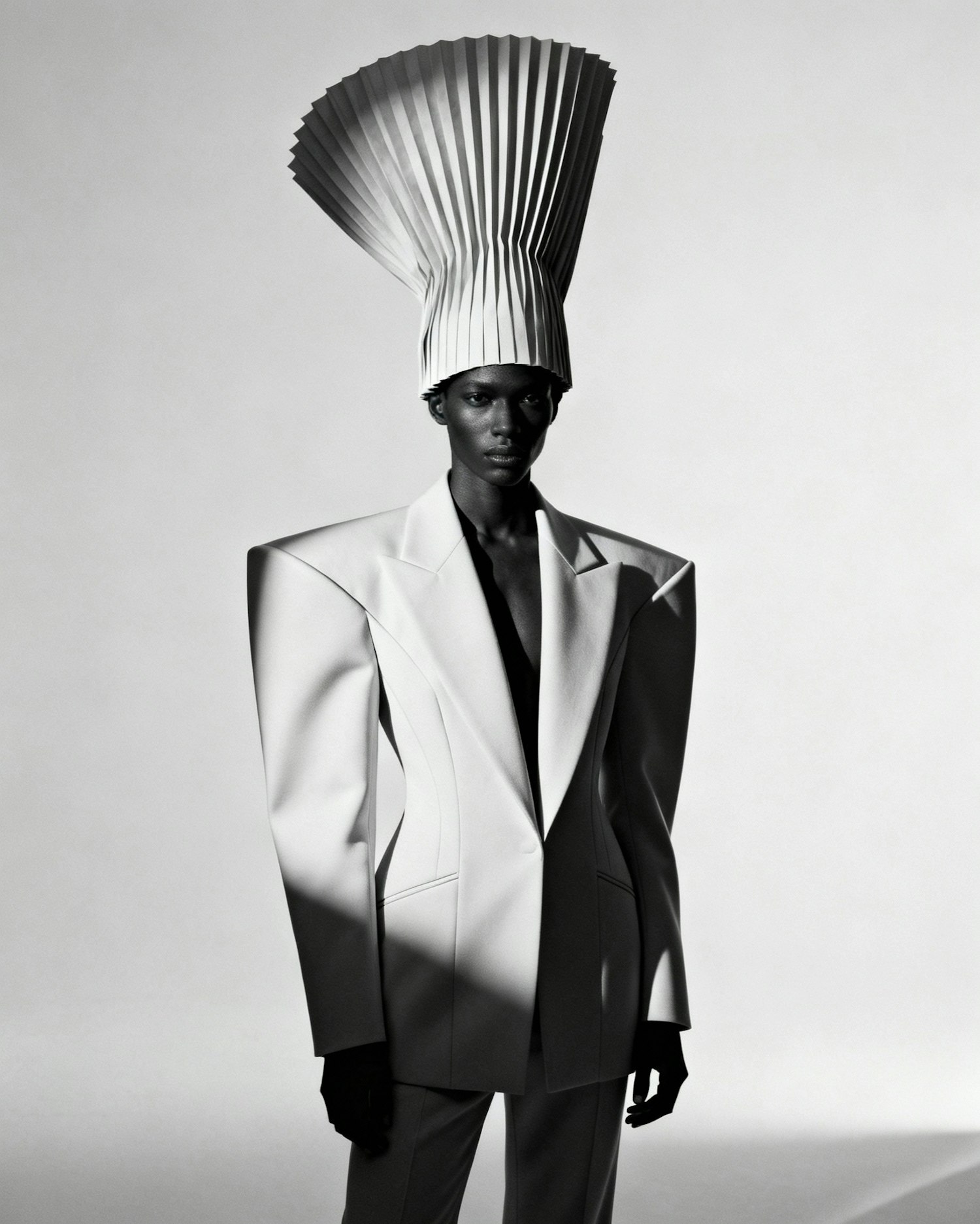 Ultra-high-definition fashion portrait of a mysterious black individual, dressed in a sculptural pleated headpiece, set against a light minimalist background. The ensemble blends futuristic tailoring with avant-garde elegance, emphasizing clean lines and bold silhouette. The pleated headpiece adds architectural drama, while the suit contours softly around the body, celebrating form and presence. Lighting is soft and directional, casting subtle shadows that enhance texture and depth. The mood is enigmatic, editorial, and visually commanding—ideal for showcasing inclusive fashion through sculptural styling and cinematic clarity.