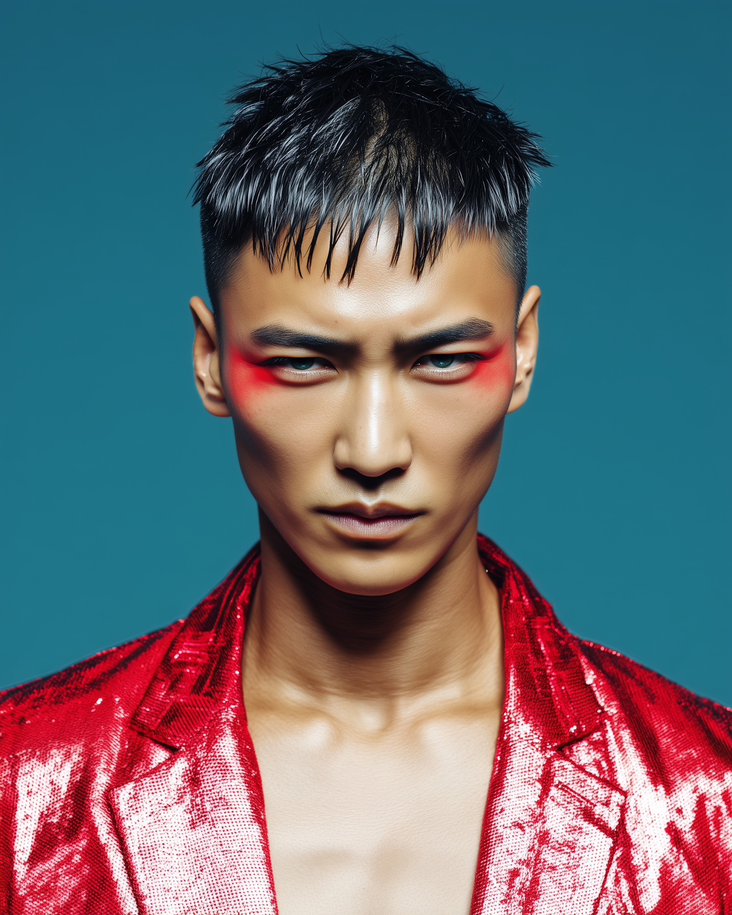 Bold portrait of a man with red makeup and a sequined jacket against a teal background, showcasing edgy fashion and dramatic styling.