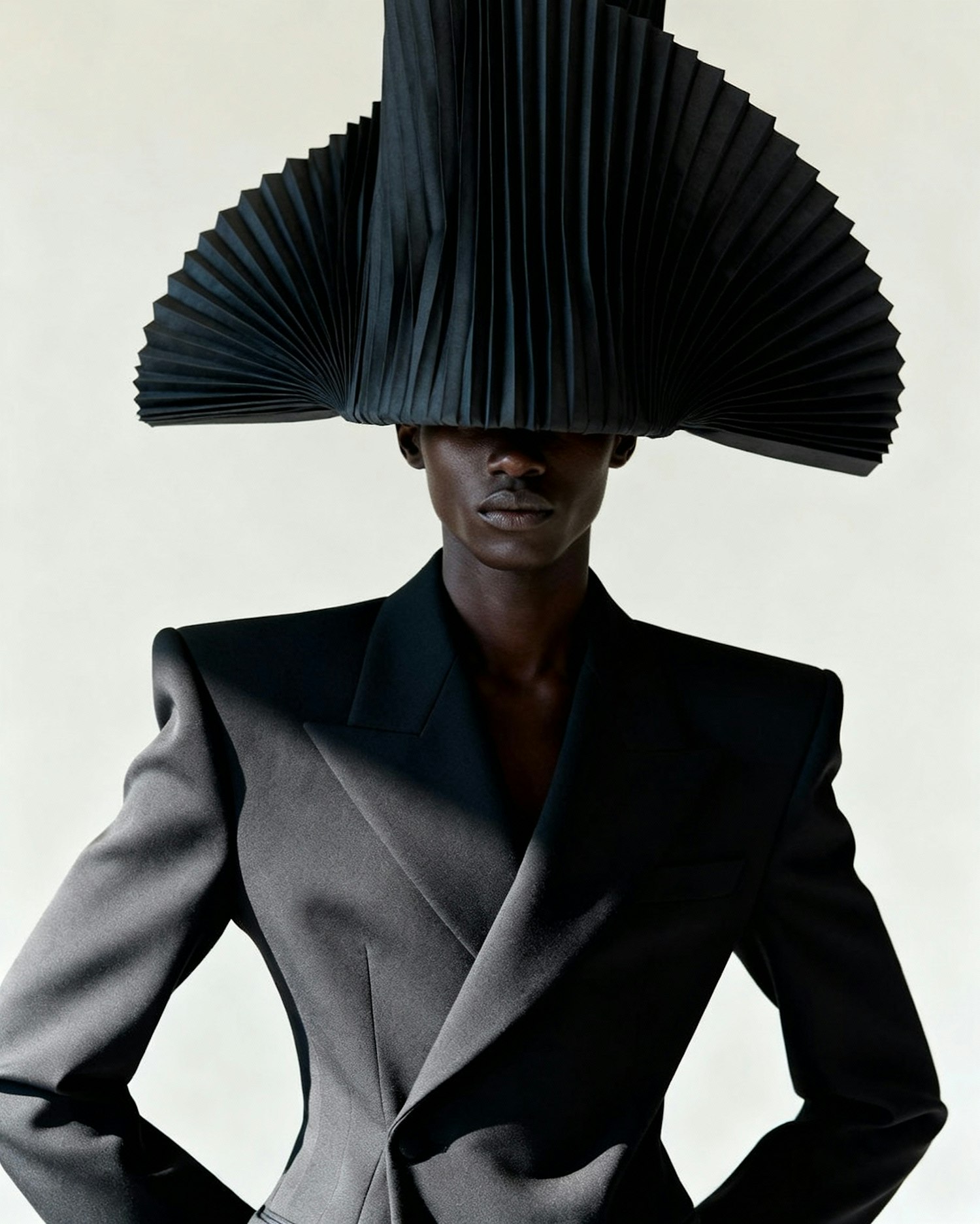 A striking portrait of a person in a tailored black suit and a dramatic pleated hat, showcasing bold fashion and artistic expression.