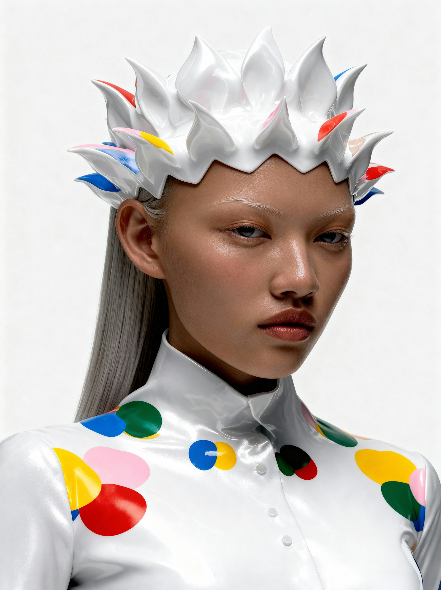A futuristic portrait featuring a person in a glossy white outfit with colorful patterns and a spiked headpiece, set against a white background.
