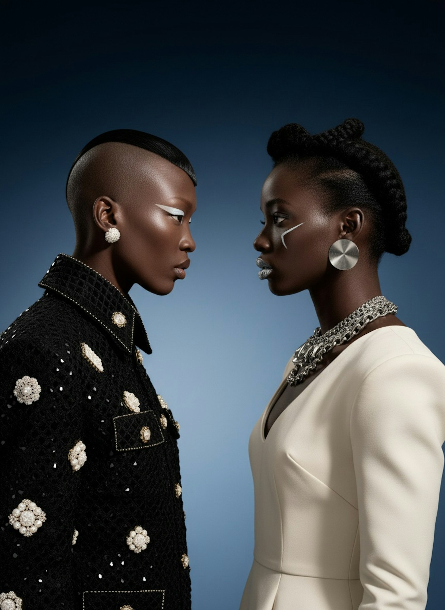 A striking portrait of two individuals in avant-garde fashion, featuring bold makeup and intricate accessories against a blue background.