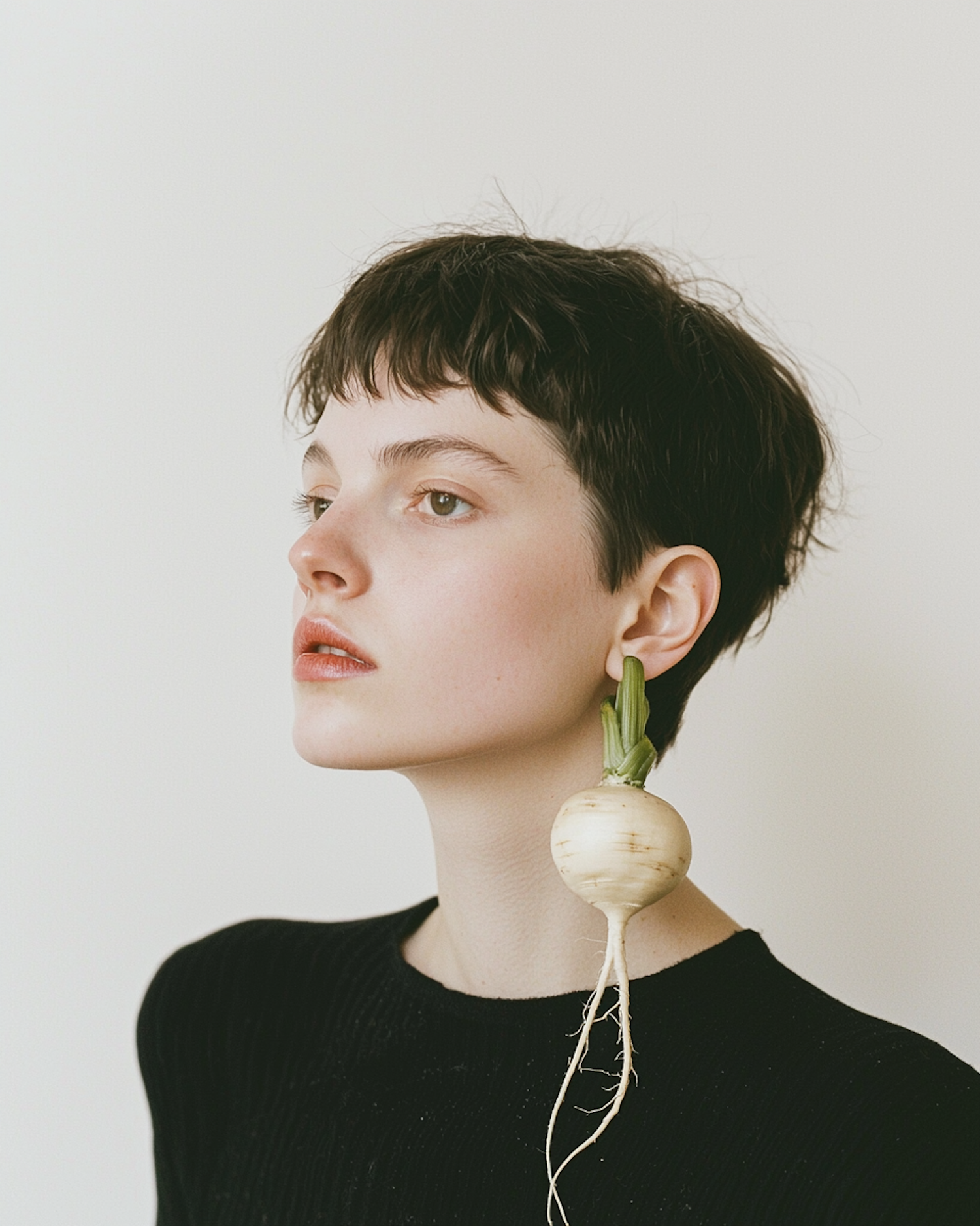 Minimalist portrait of a woman with a turnip earring, short dark hair, and a black top against a light beige background.