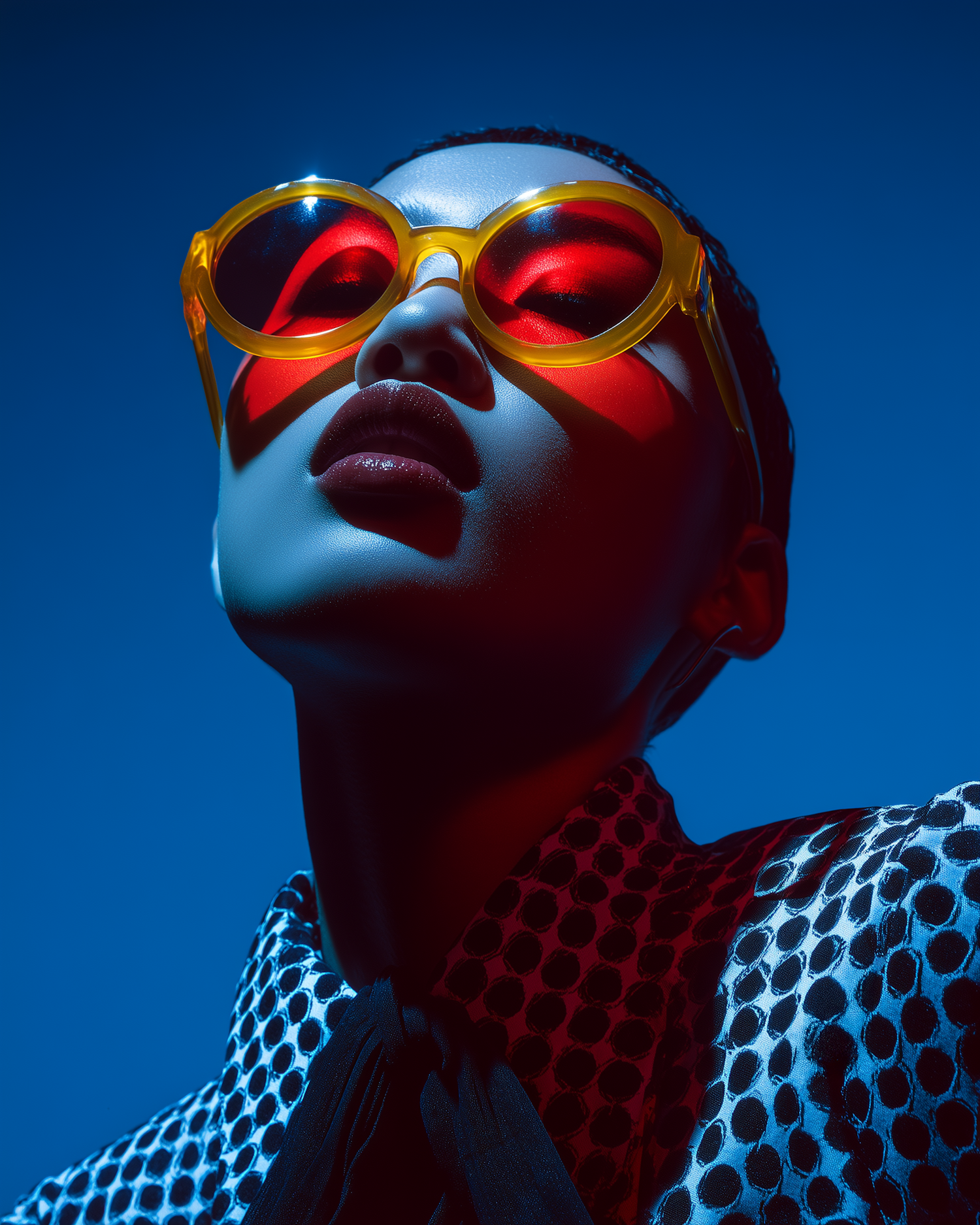 Bold portrait with yellow sunglasses, red-tinted lenses, polka-dot outfit, and dramatic blue and red lighting for a futuristic vibe.