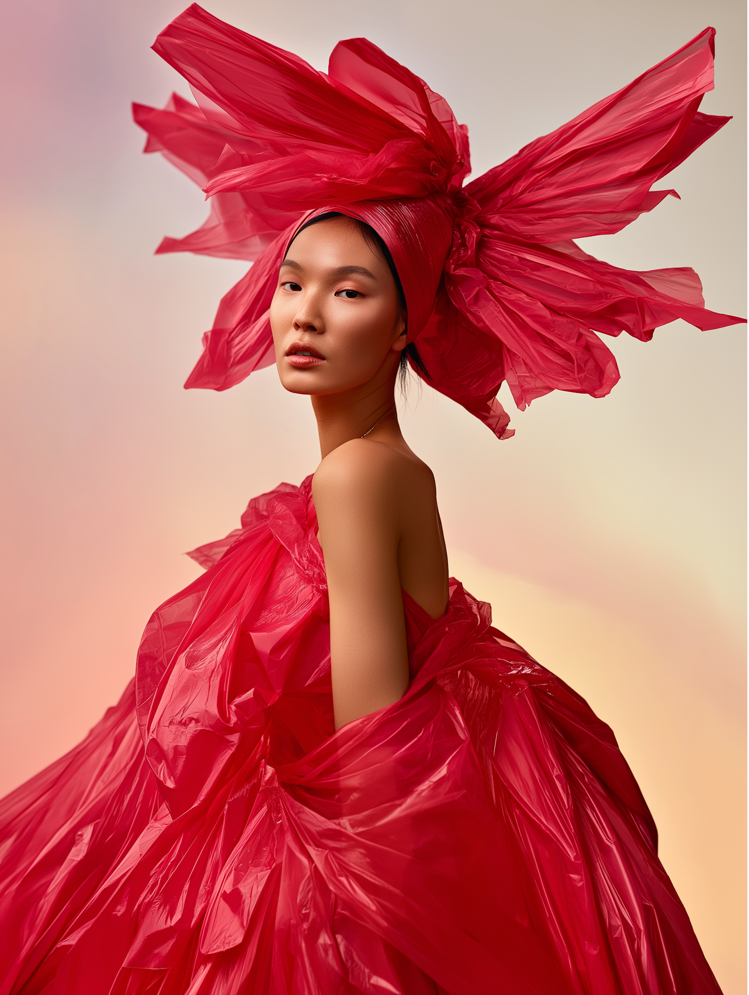 A woman in a bold red plastic outfit and headpiece poses against a pastel background, blending fashion and art in a striking portrait.