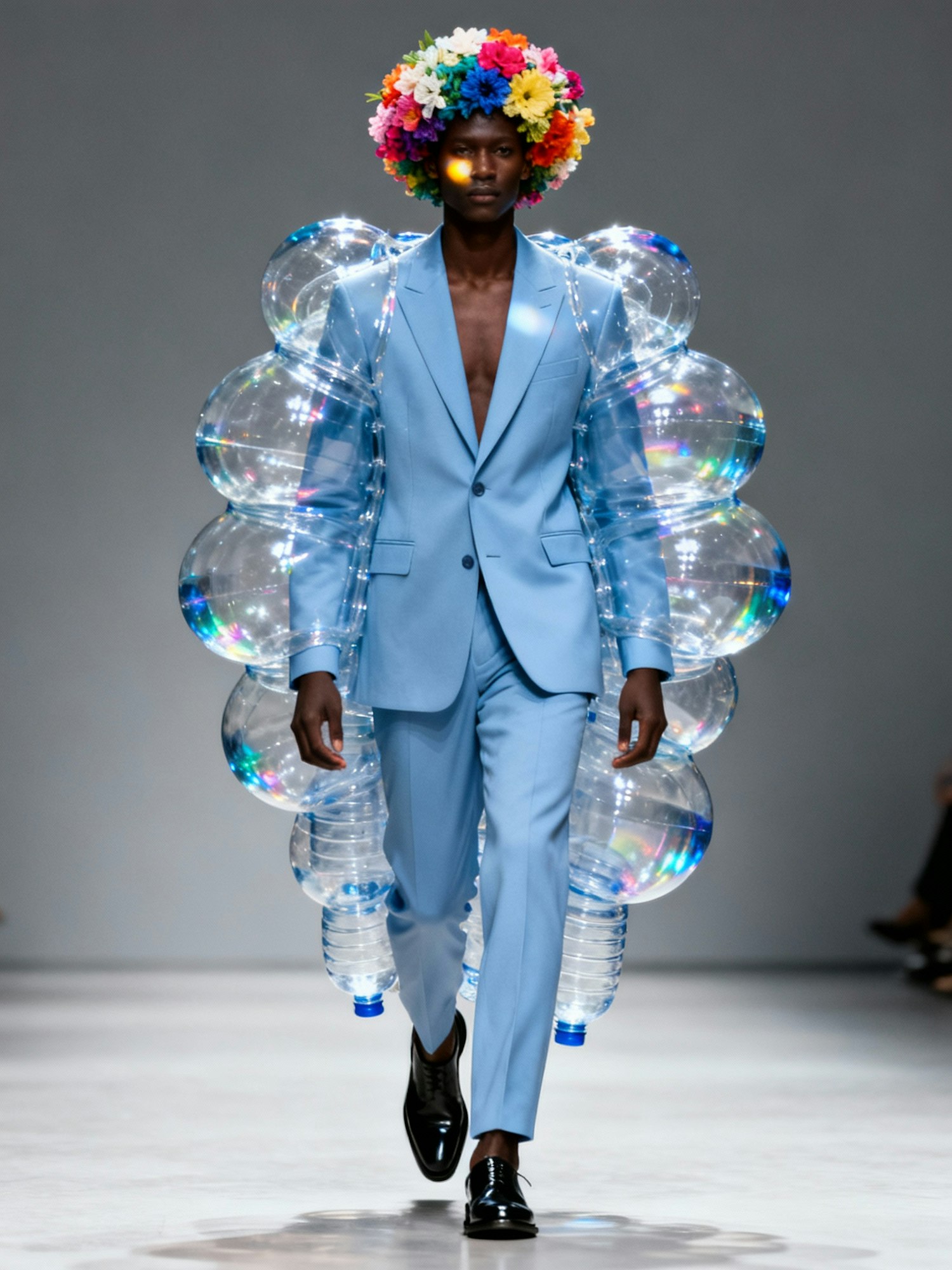 Full-body, high-definition portrait of a Black person walking confidently in a light blue suit. Their torso is enveloped in a sculptural arrangement of empty transparent plastic water bottles, forming a bulbous silhouette. They wear a colorful floral wig and black dress shoes. The look is surreal, artistic, and environmentally symbolic. The neutral gray background enhances the blue tones of the suit and the transparency of the bottles, making the layered textures stand out. Lighting is soft and directional, casting gentle highlights across the face and garment. The mood is avant-garde, performative, and editorial—ideal for a fashion-meets-environmental symbolism portrait or conceptual identity showcase.