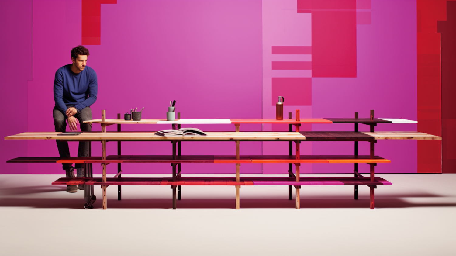 Man in blue sweater sits on a multi-tiered table against a vibrant pink geometric background.