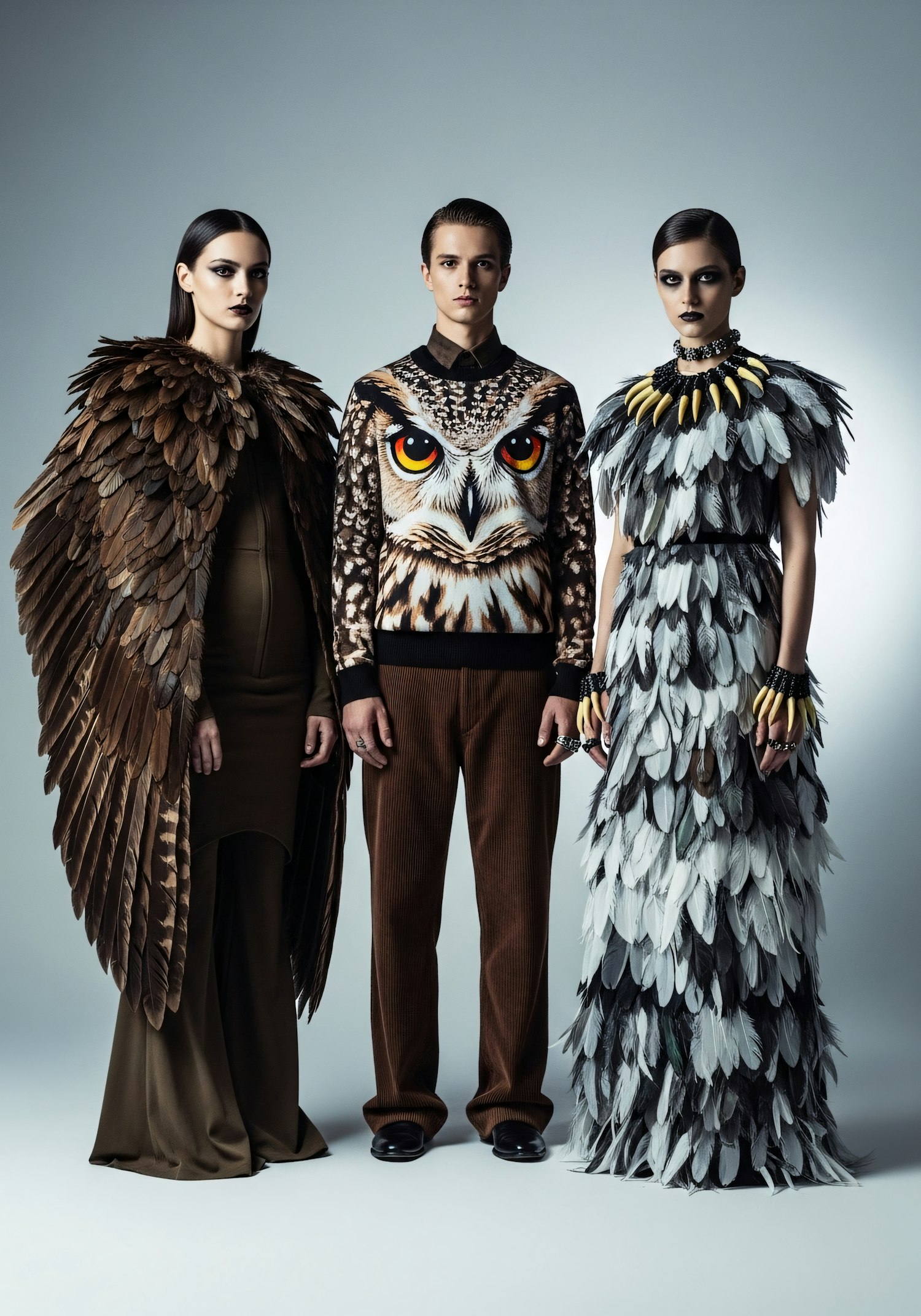 Three models showcase bird-inspired fashion with feathered outfits and an owl-themed sweater, set against a neutral background.