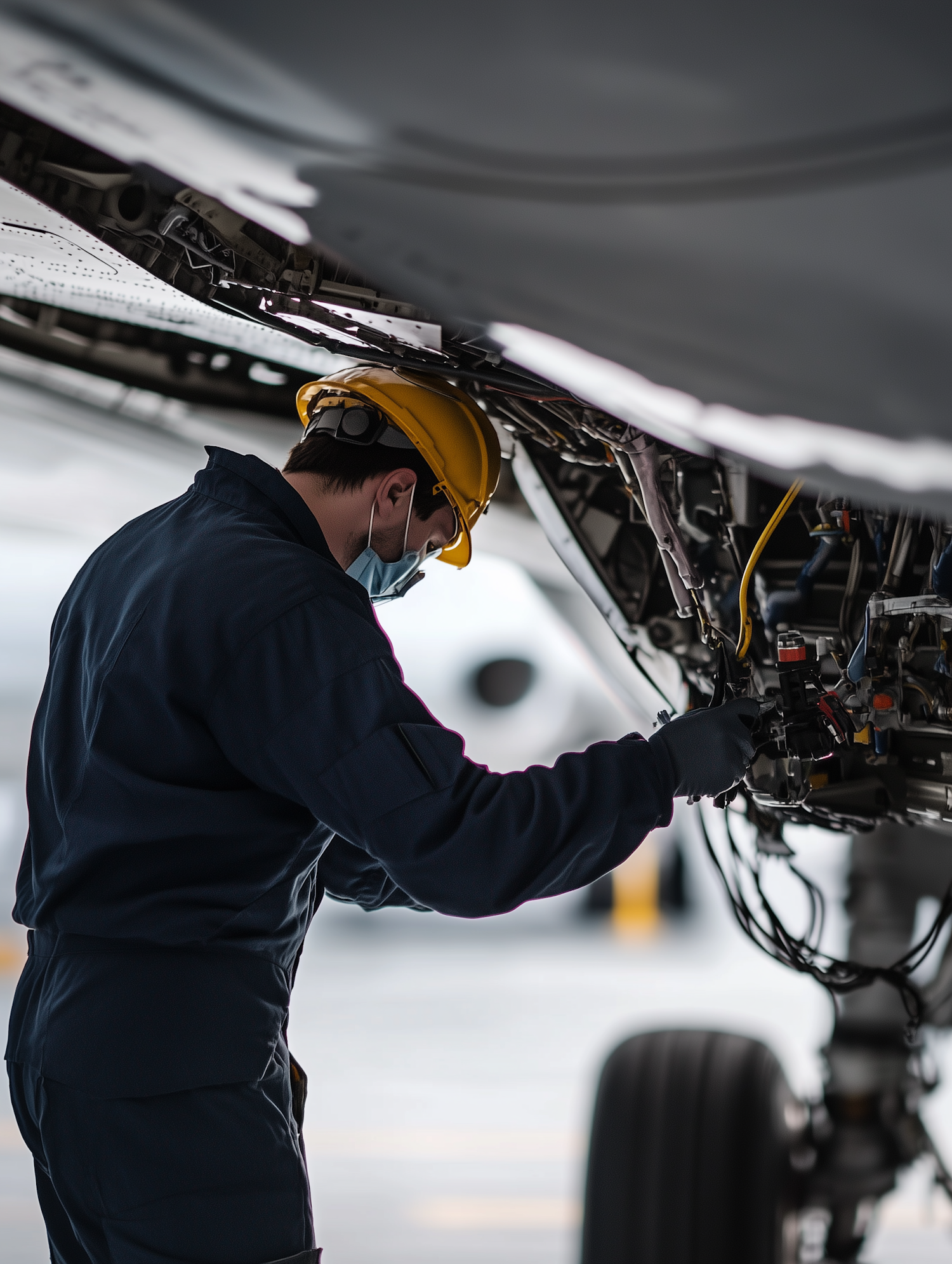 Technician in a yellow hard hat inspects aircraft wiring in a hangar, emphasizing safety and precision in aviation maintenance.