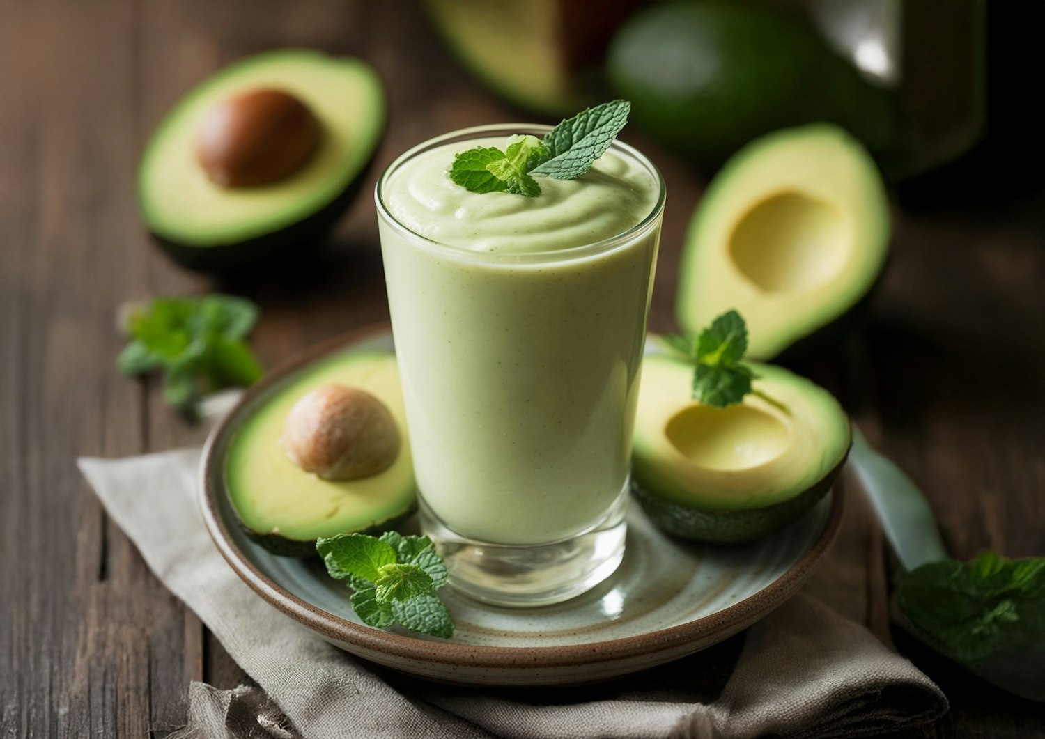 A creamy avocado smoothie in a glass, garnished with mint, surrounded by fresh avocado halves on a rustic wooden table.