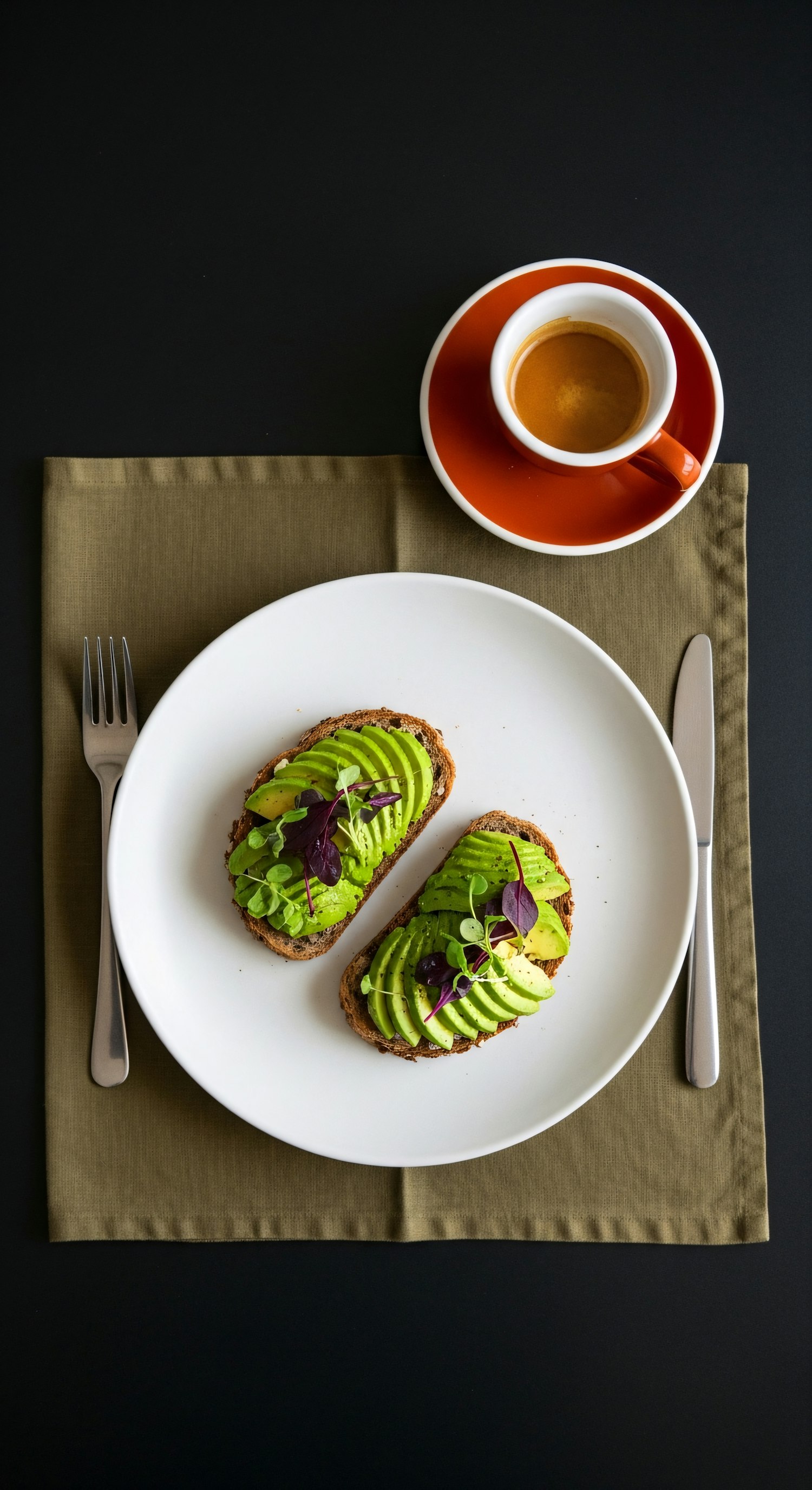Avocado toast with microgreens on a white plate, paired with an espresso in an orange cup, set on a green napkin and dark background.