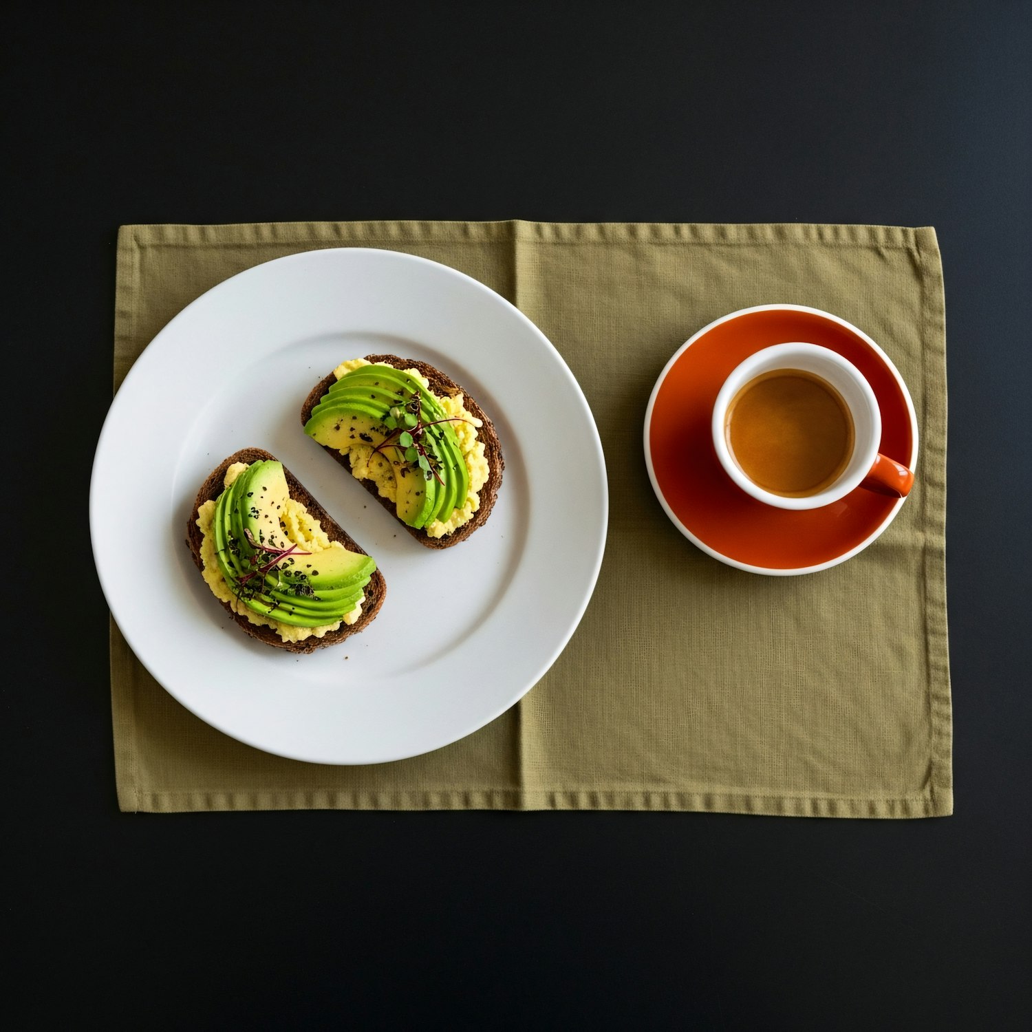 Minimalist breakfast setup with avocado toast and espresso on a dark background, perfect for food lovers and coffee enthusiasts.