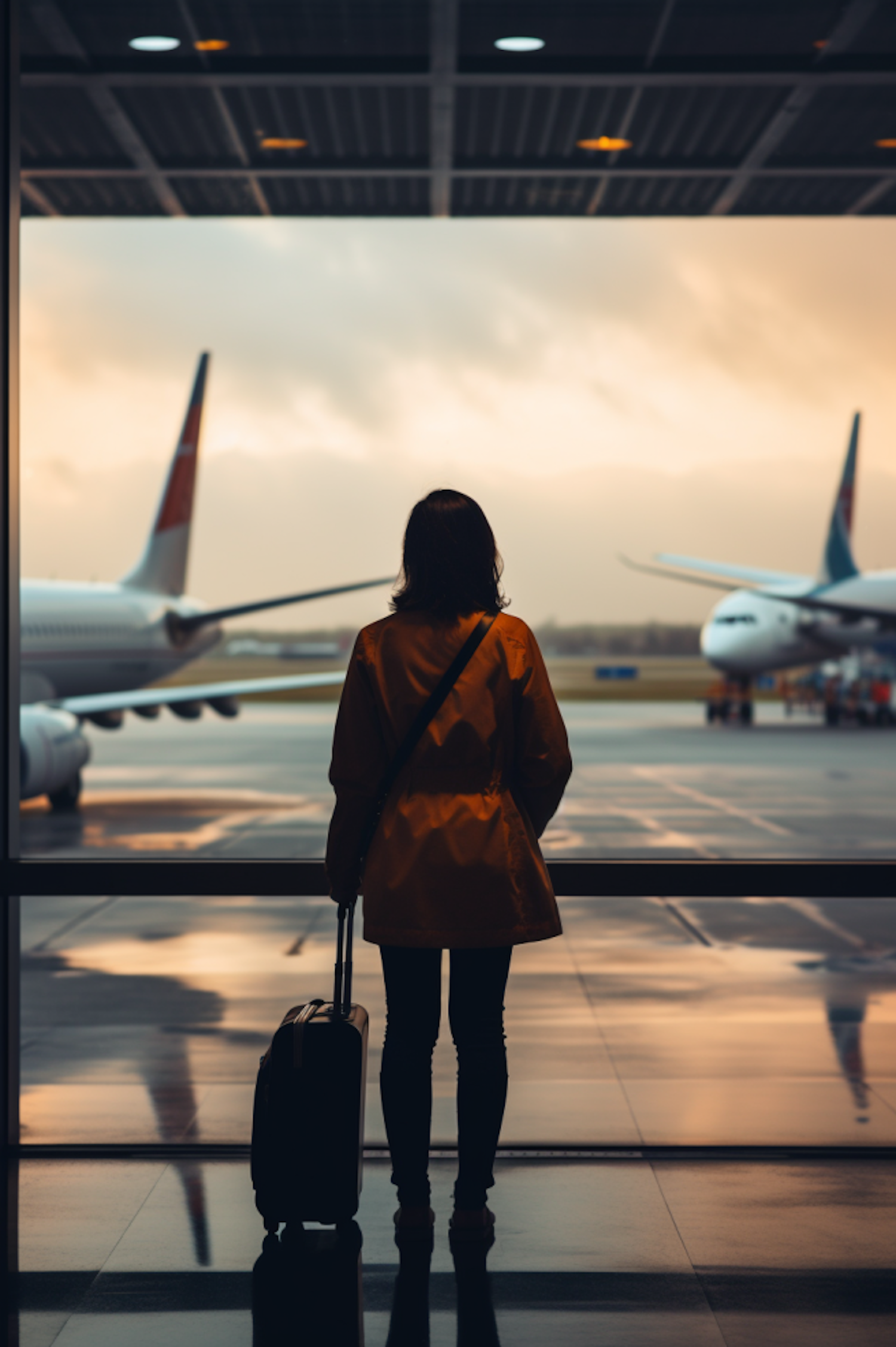 Silhouette of a traveler in a yellow coat at an airport, gazing at planes during sunset. Reflective and serene atmosphere.