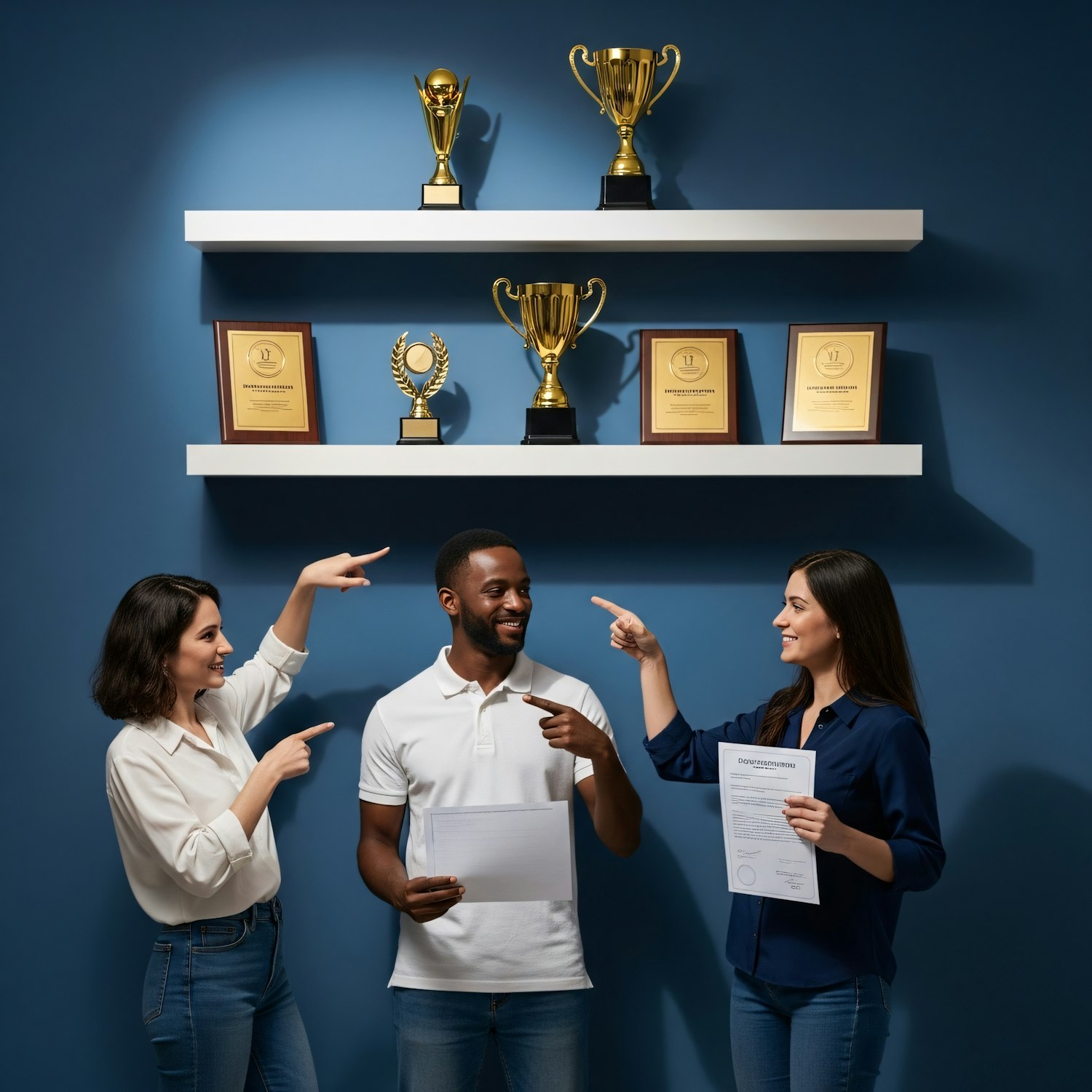 Three colleagues celebrate an achievement in front of a wall with trophies and awards, highlighting teamwork and success.