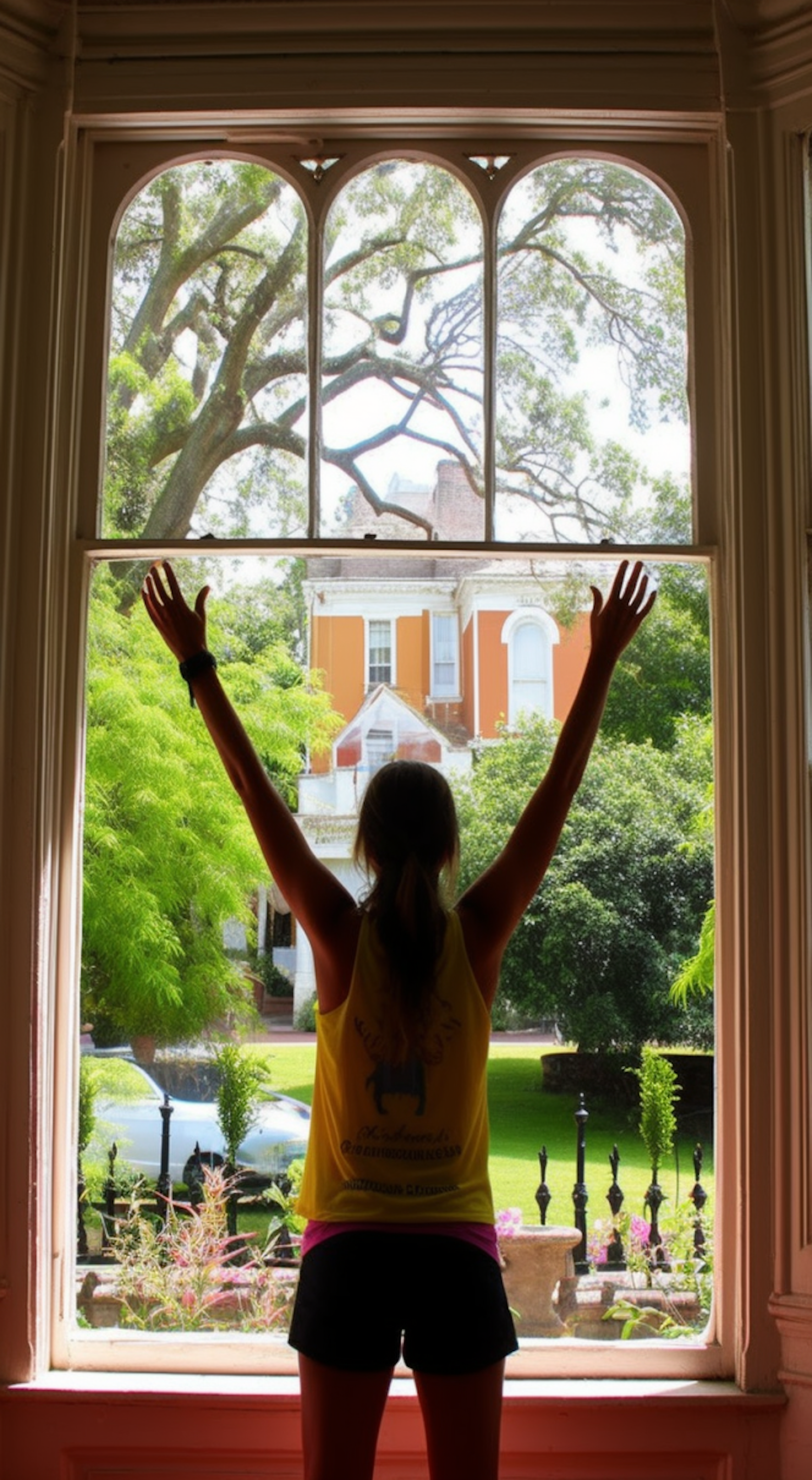 Silhouetted figure with raised arms in front of a large window, overlooking a lush garden and grand building.