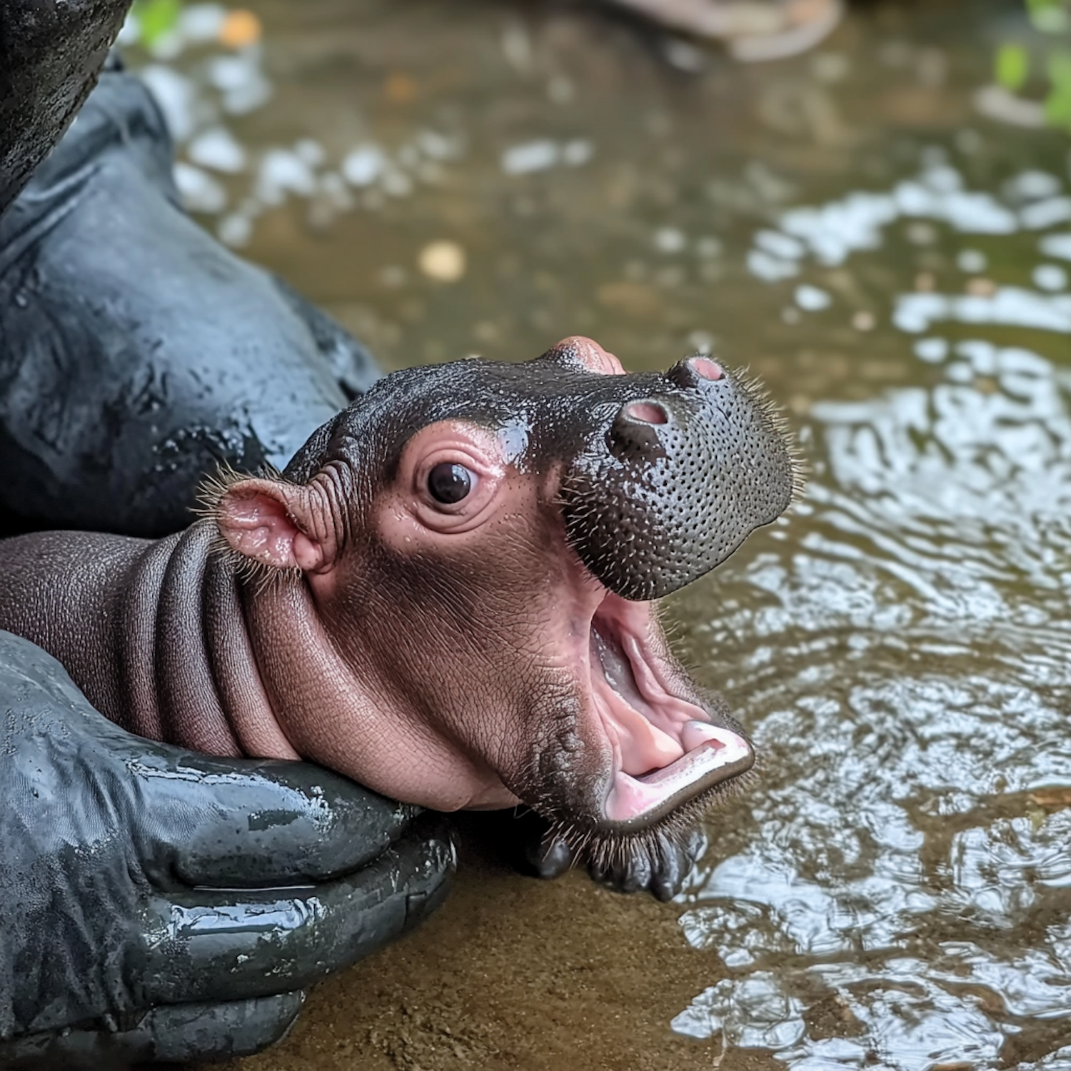 Adorable baby hippo with open mouth held gently in gloved hands near water, showcasing its shiny skin and expressive eyes.