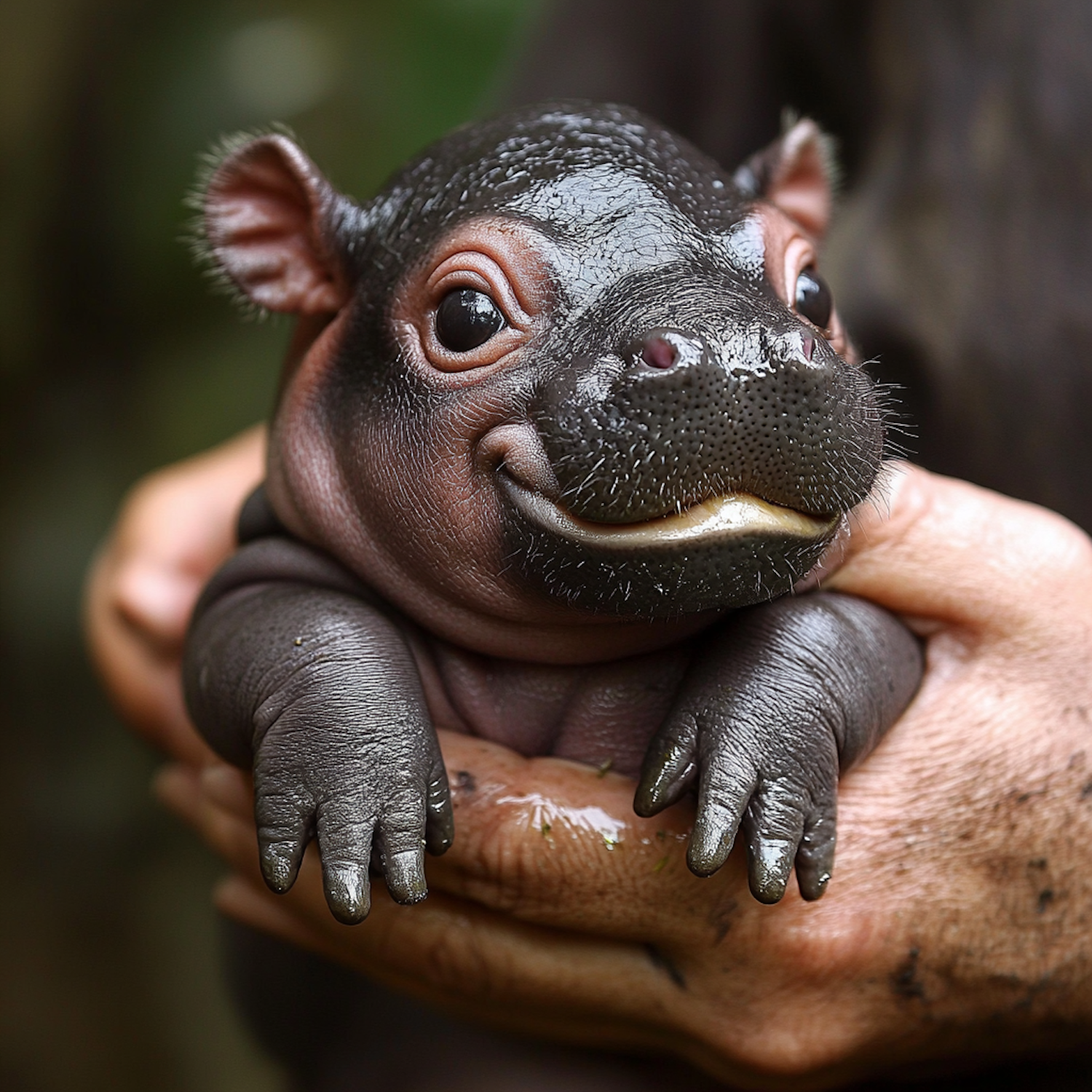 Adorable baby hippo cradled in human hands, showcasing its smooth, shiny skin and curious expression.