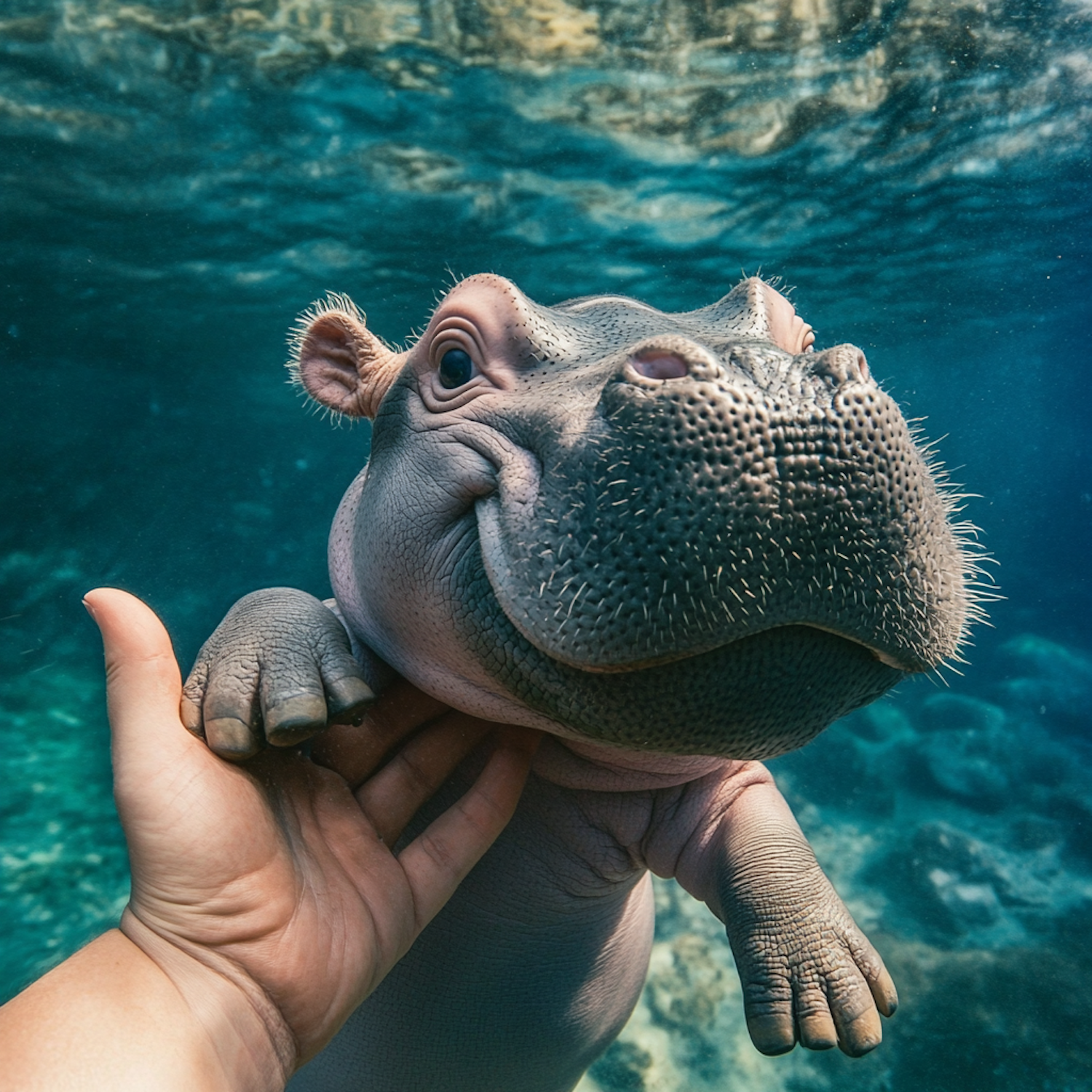 Adorable baby hippo underwater, supported by a human hand, with clear blue water and light reflections above.